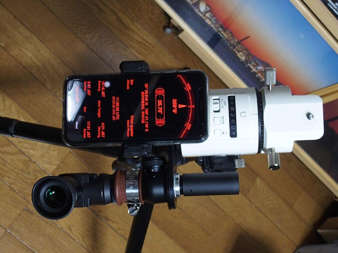 ポーラメーターの代わりにiPhoneを利用しただけのことです。無料アプリのコンパスもありますが、このアプリの良い所は磁気偏角を補正して表示しています。上から見た組合せ写真を図3に示します。