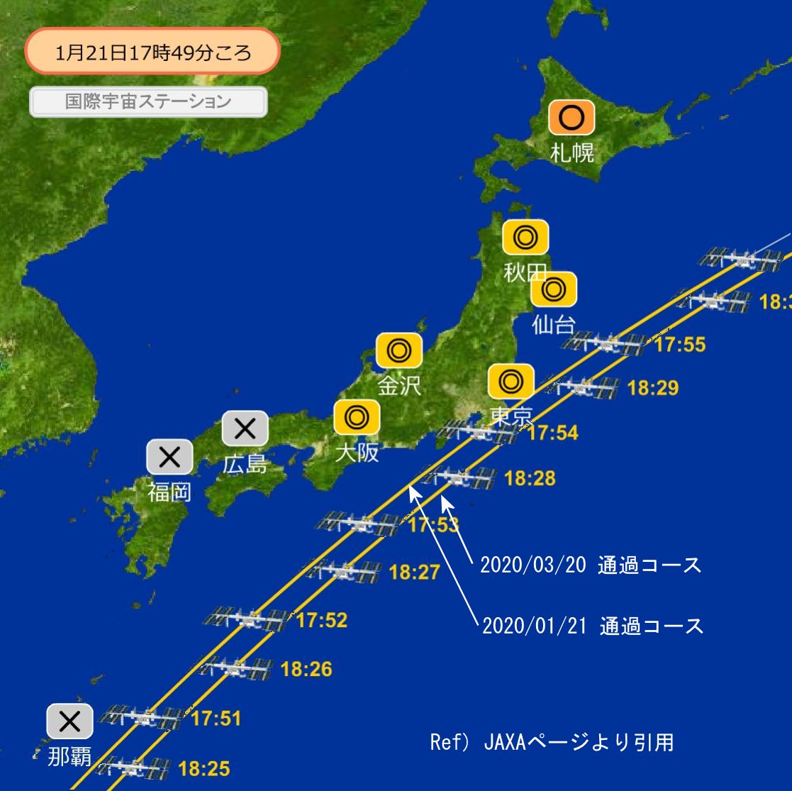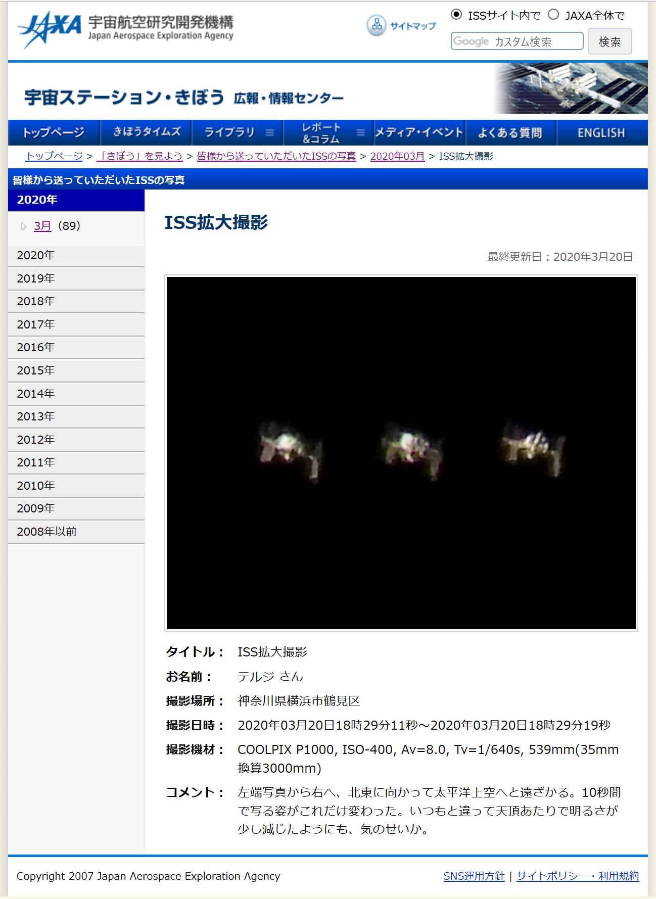 JAXA投稿はちょうど2か月ぶりです。前回はNo.663の2020/01/21撮影でした。通過コースは似ていますが今回の方が少し遠い。No.663と比較すると太陽電池パドルの傾きが少し違っているように見えます。