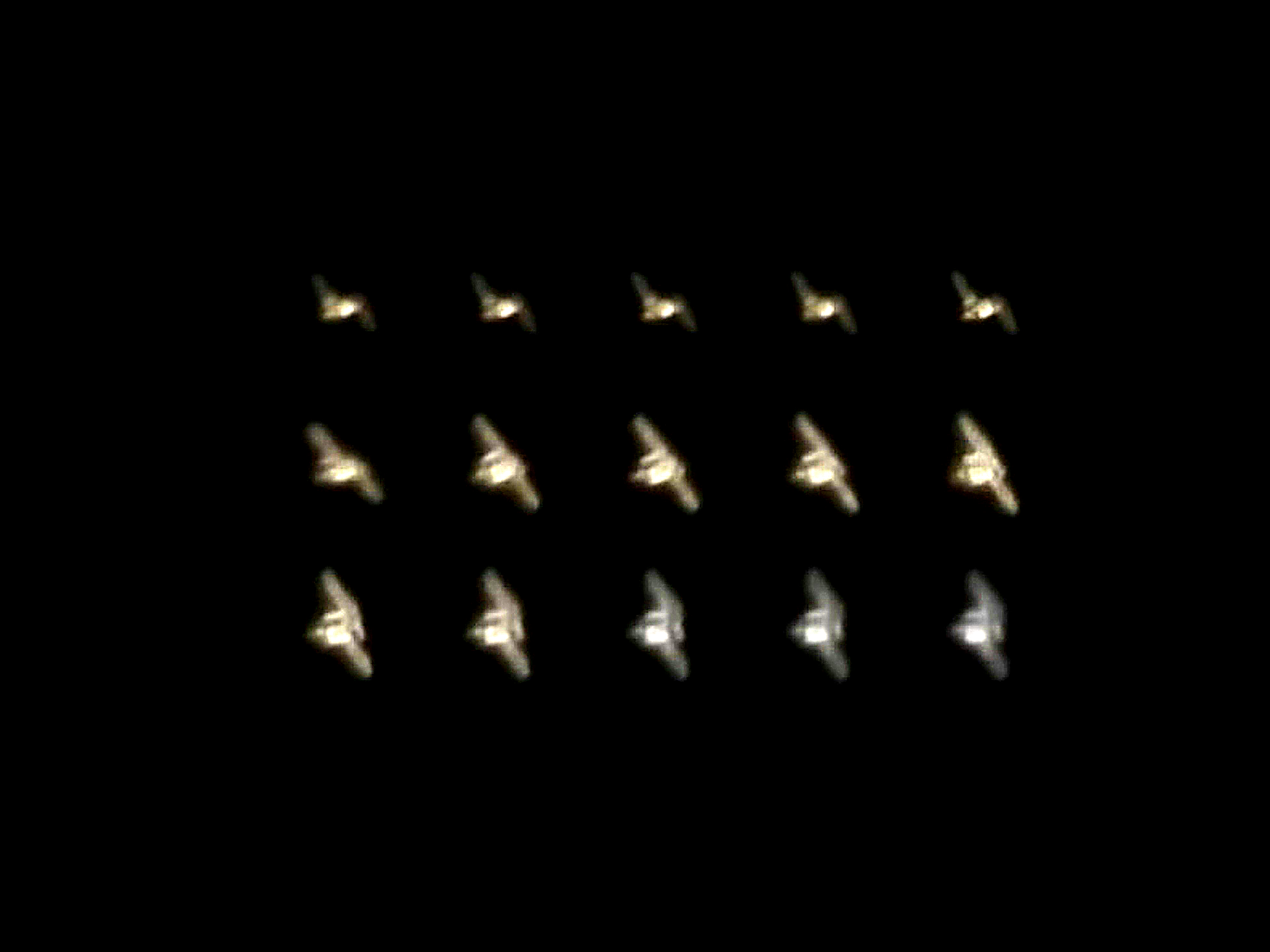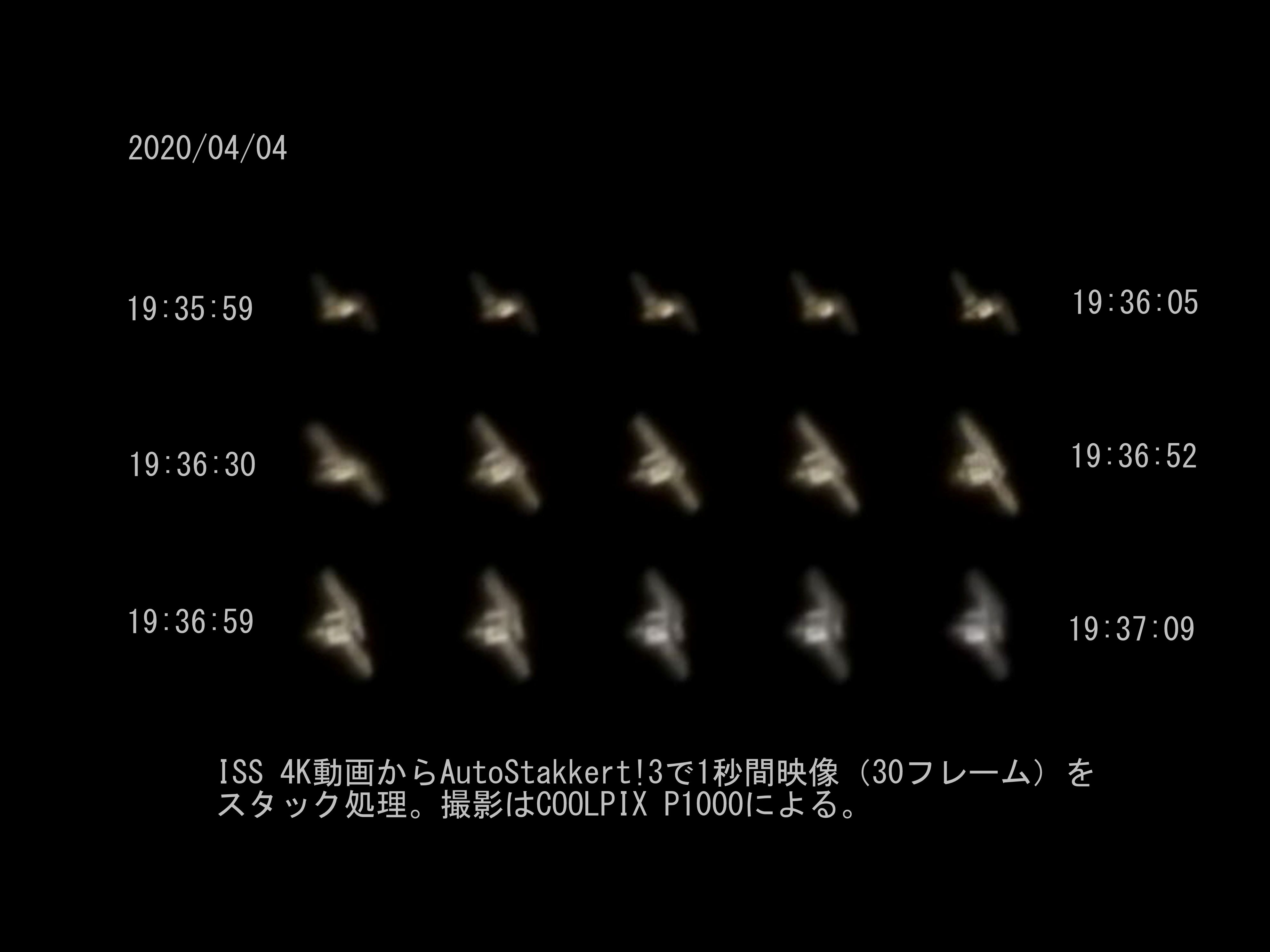 それと今回は上記スタック処理前に先がけて10フレーム毎にスタック処理し経時変化として並べてみました。図3に示します。惑星のように外観が変化しなければ何枚もスタックしても良いのですが、ISSの場合、刻々と短時間で姿が変化します。このためスタックの特徴が損なわれると考えられましたので、何枚まで許容されるか調べたものです。感覚でしかありませんが、今回の試写では1秒間程度の処理(30フレーム)にすればISSの姿勢が変わっているように見えますが処理として問題なしとしました。