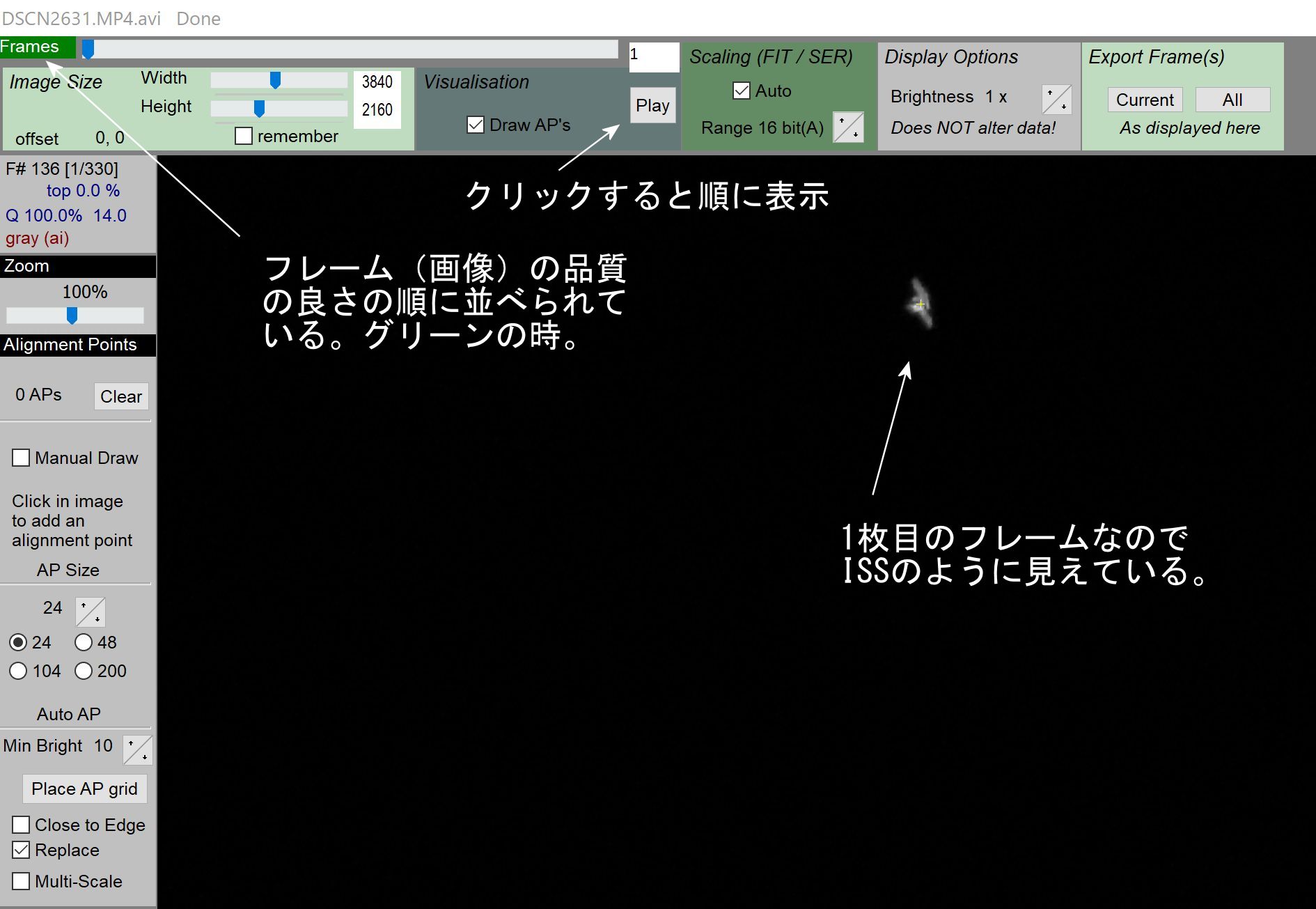 ISSを撮影したCOOLPIX P1000の4K動画(あまり長い録画ですと処理時間がかかります)をAutoStakkert!3に読み込ませた直後、またはメイン画面で2) Analyseした直後でFrame View画面を見ると左上のFramesのバーがグリーン色か黒色になっています(図1及び図2)。