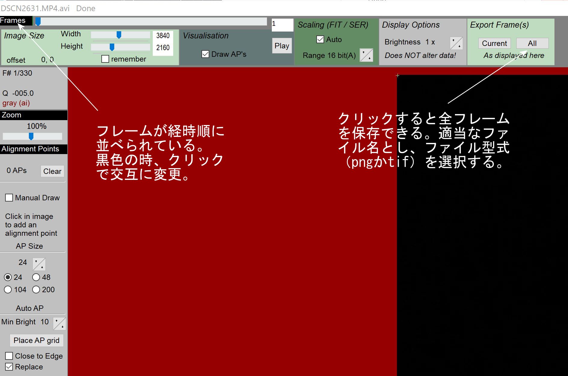 このブラックバーの状態で、Frame View画面の右上にあるExport Frame(s)でAllを押すと全フレームが順番にコピー保存されます。フレームはpngファイルかtifファイルです。