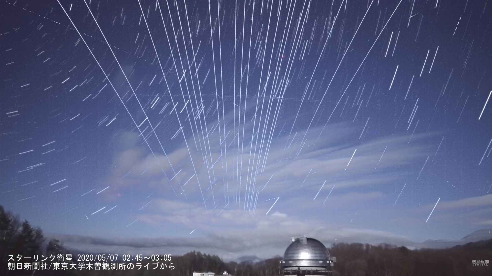 約20分間の映像から比較明処理して得られた画像を図1に示します。すべての衛星は写真上端から現れ、下端の北東に向かって進む軌跡を描きました。