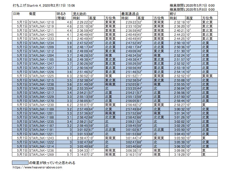 表1 Heavens Aboveによるスターリンク衛星の通過情報データ