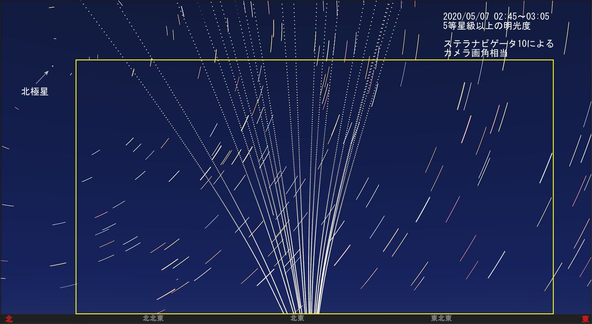 比較のため、ステラナビゲータ10で作図した木曽観測所地点におけるスターリンク衛星群の20分間の光跡を図2に、Heavens Aboveで得られた通過データ(木曽観測所基準)を表1に示します。見られたスターリンク衛星は2020/02/17に打ち上げられたStarlink 4群です。図2に黄色で囲んだ枠はライブカメラの画角に相当します(図全体の上下幅は50度の高度範囲として表示しています)。表1の水色の欄の衛星が通過したものと思われます。但し、現実の写真には中央右側の3衛星が少し右側にシフトしているように見えます。この差の原因は明らかではありません。また、観測写真では横方向の軌跡が薄く見えていますがStarlink 3群等によるものと考えられます(図2の作成時にはそれらの衛星の通過情報は加えていません)。左上コーナーからの右下コーナーに向けての光跡は飛行機ではなくてスターリンクとは別の人工衛星(あじさい?)と考えられます。