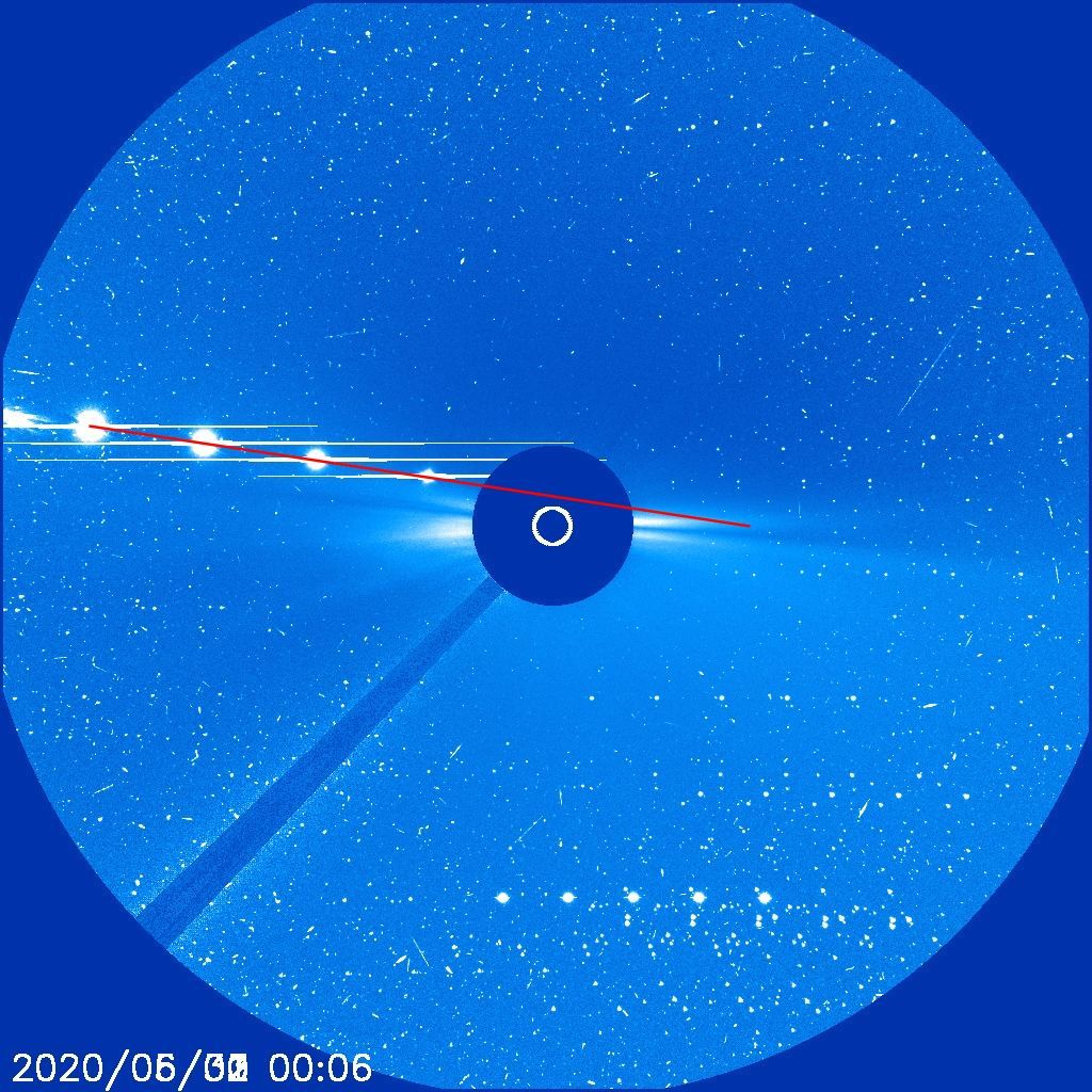 2020/05/30~2020/06/03の同一時刻におけるSOHO LASCO C3画像5枚を比較明で示した画像です。大きめの白丸に横棒が付いているのが金星、中央の白い円が太陽の輪郭です。日付表示は処理で重なっています。