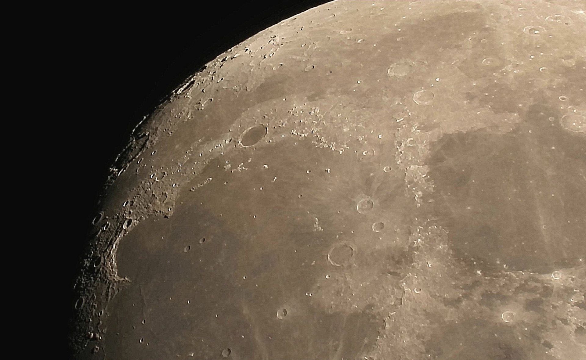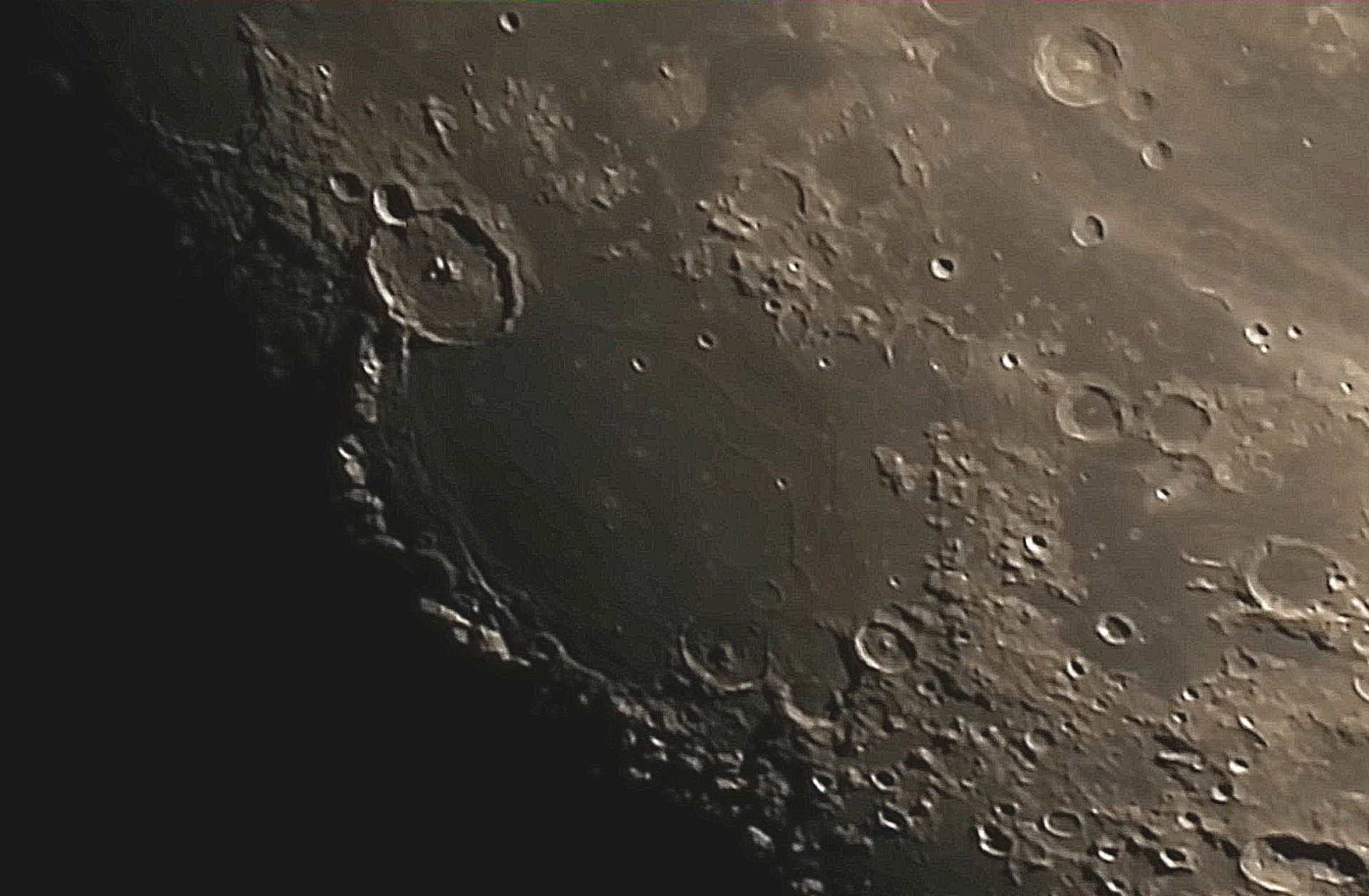 ISSの去った後、月を。空の高い位置ですので薄い雲の影響も少しはましでしょうか。 この月齢では撮るところがいつも同じかもしれません。目立っていて撮りやすいからです。雨の海のプラトー、虹の入り江、アルプス谷、今回は三枚目は湿りの海、名前は知らなかったけれど、クレーターに目が行きましたので。