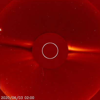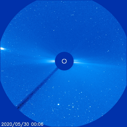C3画像は2020/05/30~06/09の10日間の00:06(UTC)における一日毎の変化をGIFにしたものです。途中時刻がズレている画像もあります。太陽に接近した画像は遮蔽板に隠されていますが、太陽にかすらなかったことが最終画像の比較明画像から想像できるでしょう。