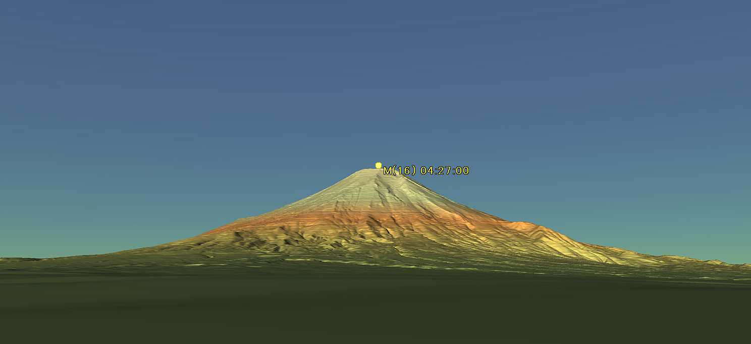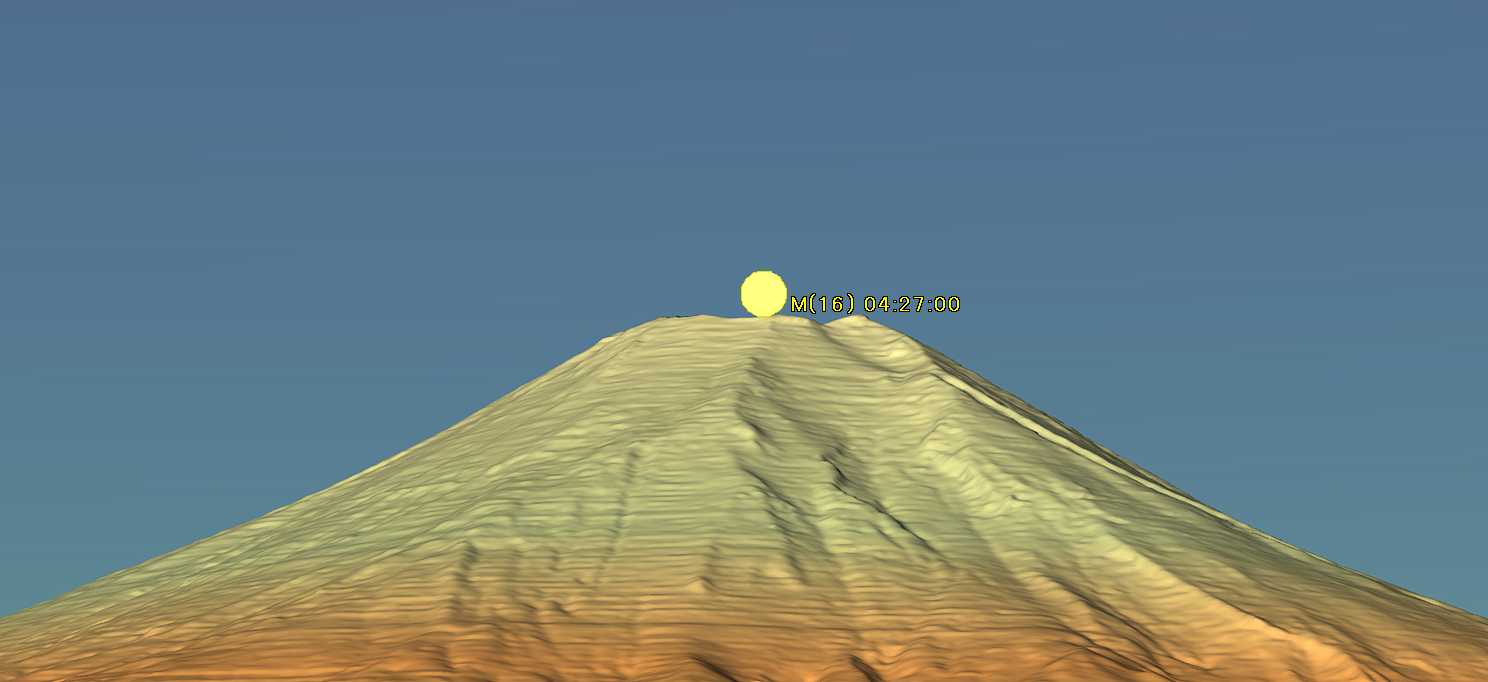 ステラナビゲータでは当日の日の出は04:34でした。撮影時刻の04:27では太陽はまだ地平線の下ですが、薄明で空は明るくなっていたはずです。月齢は15.5です。カシミール3Dの画像では朝焼けは描けませんでしたが、写真ではきれいな薄い赤、瞬間映像の美しさを連想させられます。