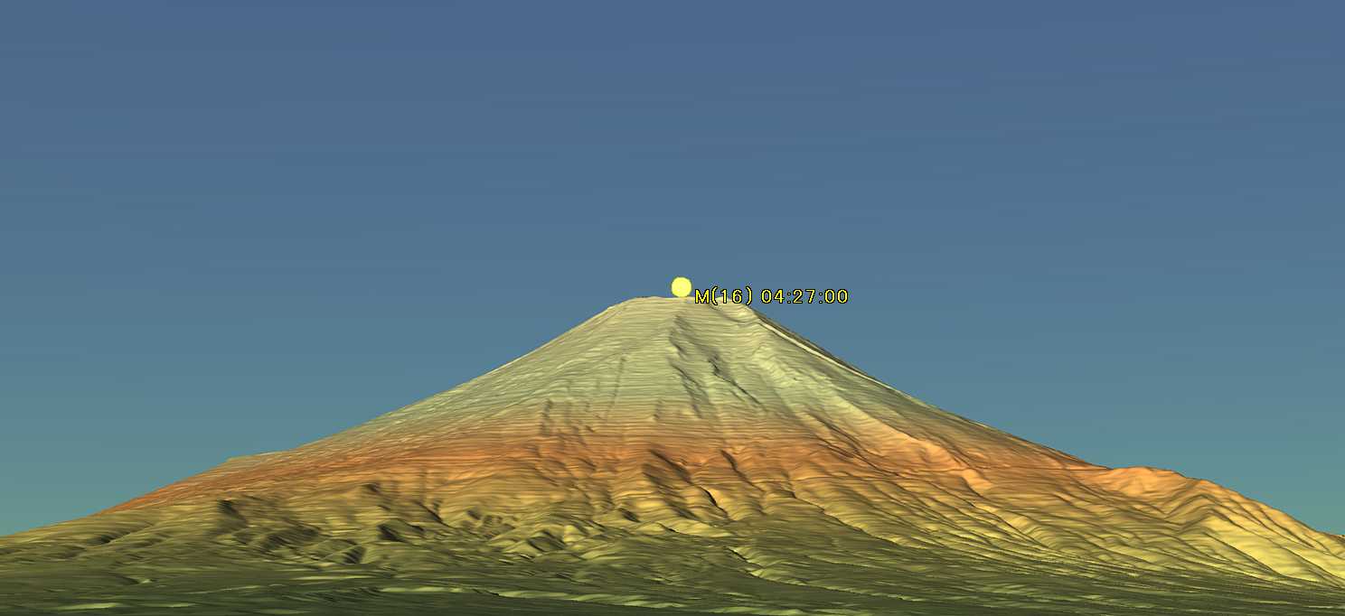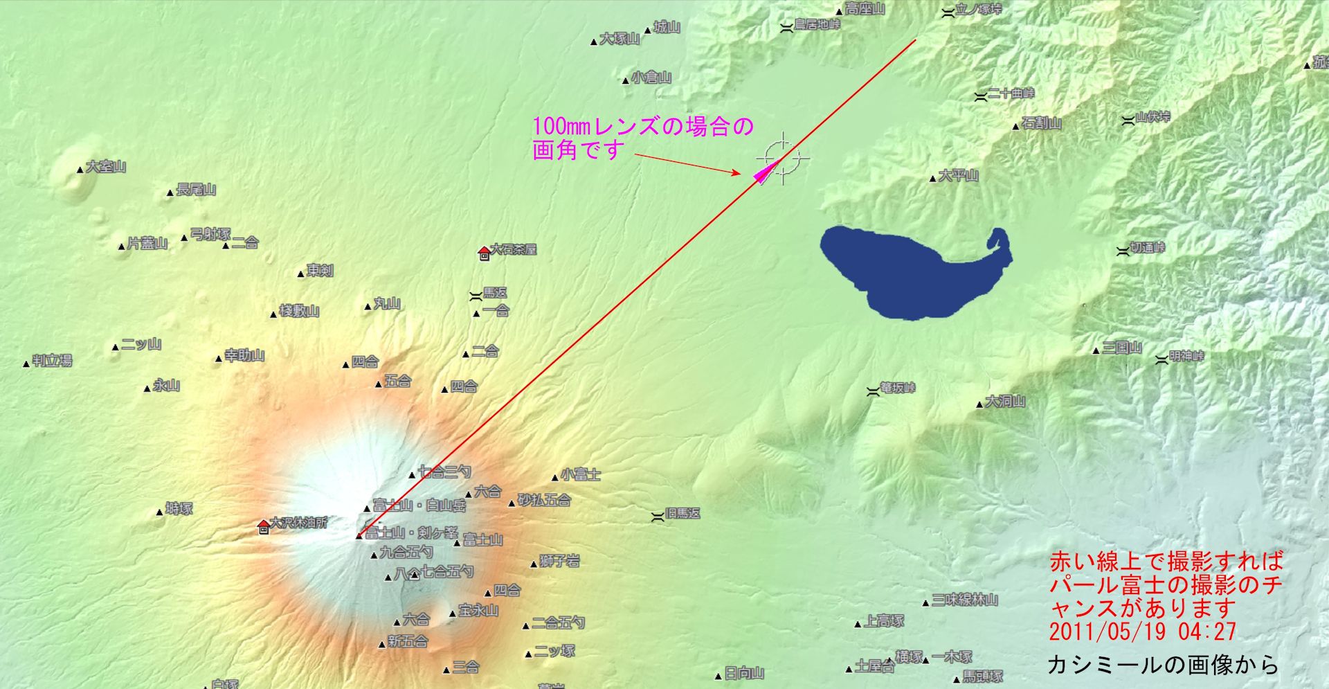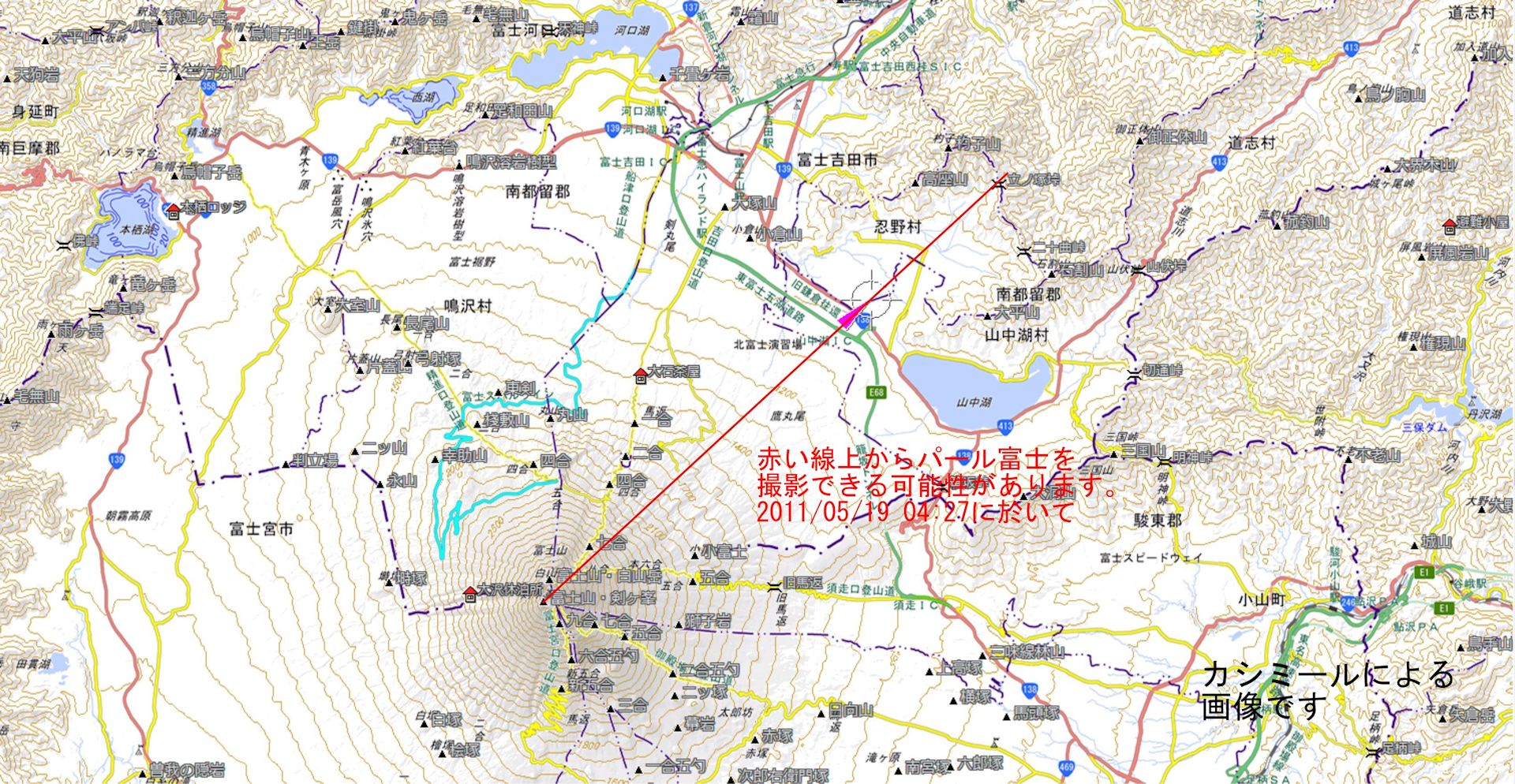 No.719に続いて、朝日新聞の記事の中に基本となる一枚写真の例が載っていましたので、この写真についてもカシミール3Dでシミュレーションしてみました。写真は説明欄に「天野秀光さんが、2011年5月19日午前4時27分、山梨県忍野村で撮影」と記述されています。画像は下記のとおりです。