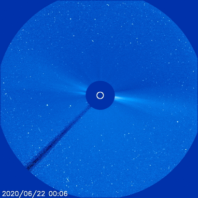 右下に写っています。テイルも見えています。単純に斜めに移動して視野から消えてしまいましたが、それでも太陽に近づいています。ステラナビゲータで確認したところ、近日点は2020/07/03なのですがC3画像にはもう写らないコースです。