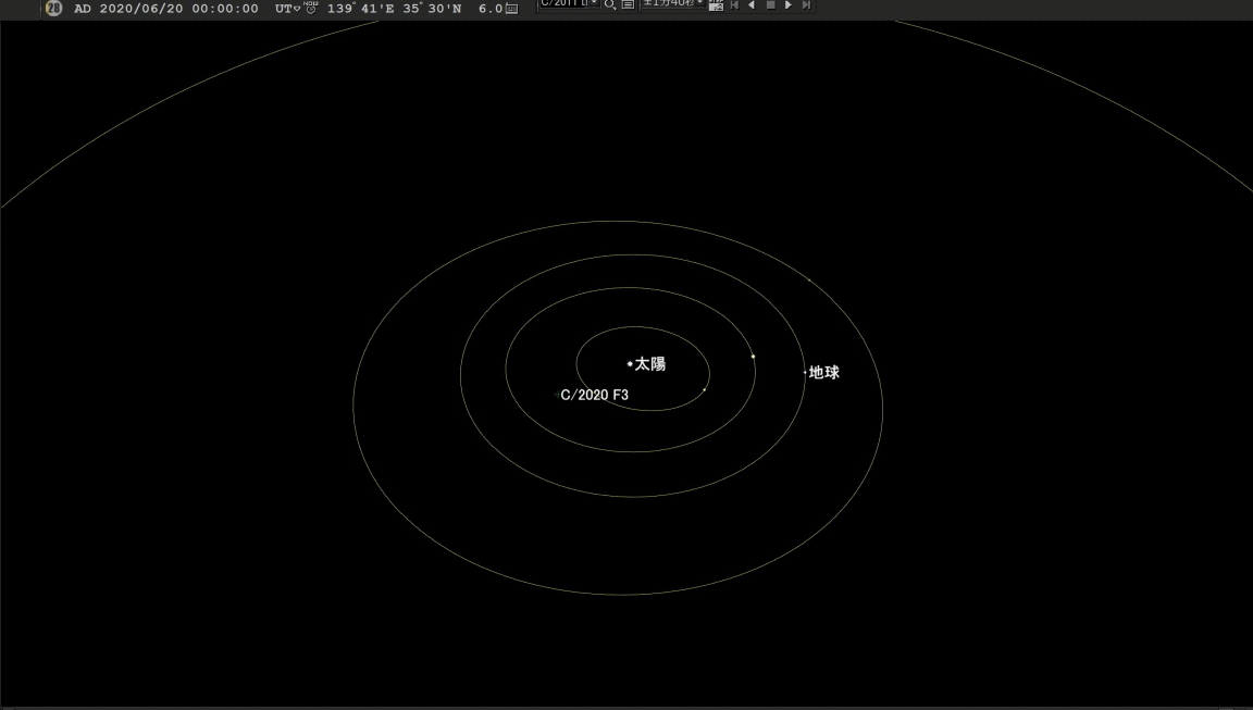 参考にステラナビゲータで作成した太陽系表示での動画を以下に示します。2020/06/20~2020/07/20の一か月間の動きです。左上に日時を表示しています。C/2020 F3が彗星です。三次元表示なのですが、わかりにくい。途中、彗星の軌道が線で表示される日が黄道面南側から北側に移した時点、そのあと、一時停止する日が近日点、以後、地球との距離を縮めた後、遠ざかります。