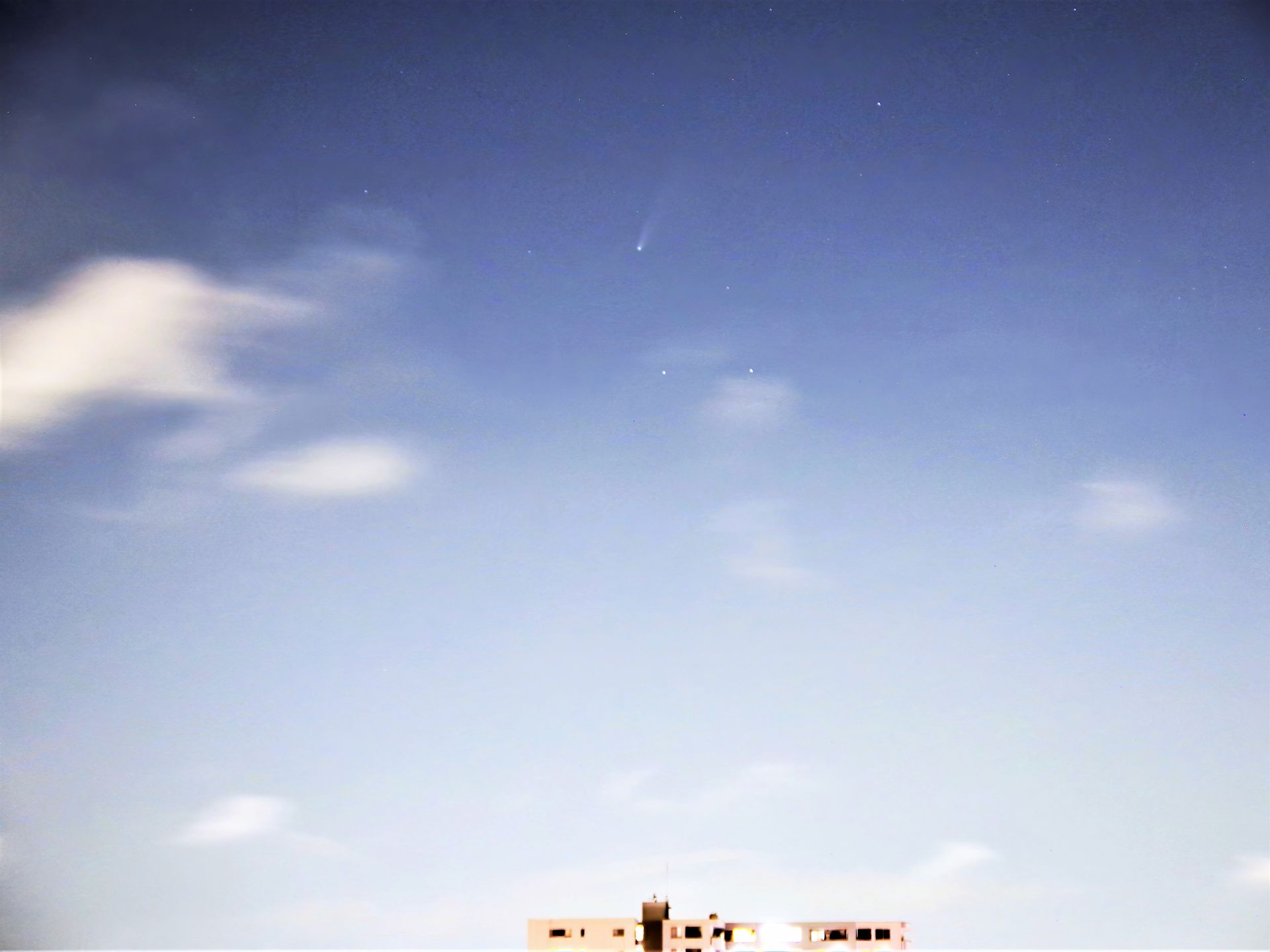 一か月ぶりでしょうか、やっと雲は流れていましたが晴れました。彗星ネオワイズを撮ろうとカメラを北西に向けました。人工光真っただ中の横浜、双眼鏡でも確認できませんでしたが、カメラには写りました。画像処理で浮き出させた写真を以下に示します。昼間のように写っていますが、月も出ておらず暗めの空で撮りやすかったように思います。画像を調整するとテイルもはっきりした彗星です。都会の光害地域での撮影例はほとんど見られませんが、もっと美しい写真はAstroArtsに多数載っています。数日前に晴れていたら、もっと撮影機材、撮影条件等も試してみたかった。また次の明るい彗星が現れることを期待して……。