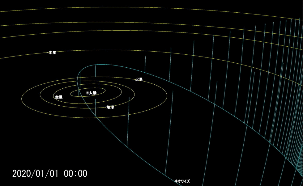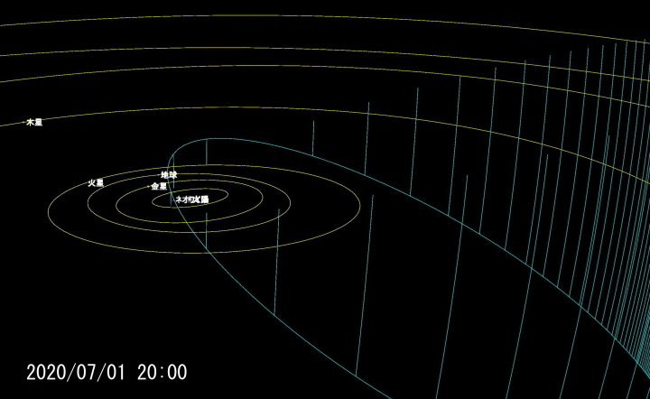 このネオワイズ彗星の太陽系軌道を知りたくNo.724に触れましたが、黄道面と交差しているイメージが容易に浮かばず、再度、ステラナビゲータ11から立体感をつかむことにしました。2020年1月~2021年1月の一年間と、近日点を迎えた2020年7月の一か月間の彗星の太陽系軌道を動画(GIF)にしてみました。合わせて銀河を背景に彗星の位置を太陽系3Dにした画像も示します。