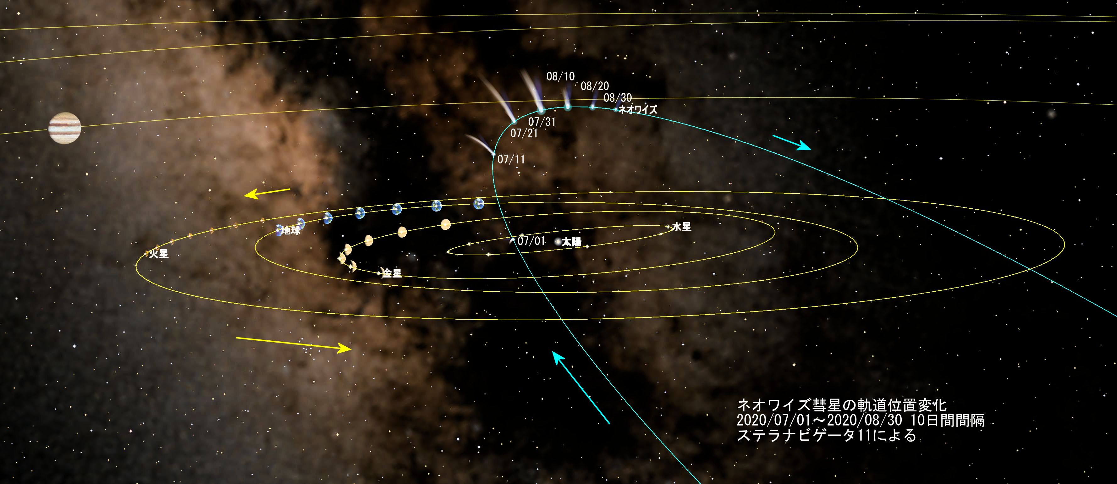 ネオワイズ彗星の公転周期は5000年台とか6000年台とか言われていましたが最近の情報(Wikipedia)では6,700年とあります。ステラナビゲータ11によれば7,160年です。このような差は彗星の発見が今年ですし、観測データが詳細になるにつれてアップデートされているのかもしれません。