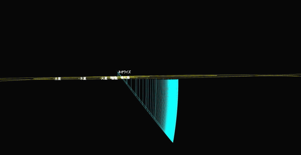 太陽の周りの惑星を黄色、ネオワイズ彗星を緑で示しました。立体感を持たせるため彗星の楕円軌道に黄道垂線を縦の線で示しています。プラスして太陽系を水平にした場合(表現が抽象的ですが)のズームイン動画(GIF)も載せておきます。これで何とかイメージをつかめたように思います。黄道面の南側から太陽に向かって、少し北側に出た後、近日点を過ぎ方向転換して再び南側に向かうというコースです。