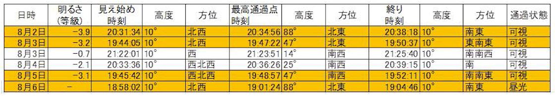 8月になるとISSの日本列島周回軌道は2日、3日、5日です(夕方/夜のみの拡大撮影チャンスです。早朝モードはこの限りではありません)。関連情報を添付しておきます。情報は横浜地区(関東地方であれば似たようなものです)を基準として表示しています。08/02は天頂付近で地球の影に入って消えます。