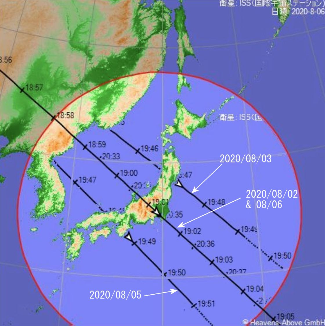 ページ下記にあります坂井様のコメントを反映し図を更新しました。ISSの軌道データは最新(2020/08/02時)によりますが直前に確認すれば確実です。また、スペースドラゴン関係のアンドッキング等の情報で時差換算が間違っていましたので訂正。