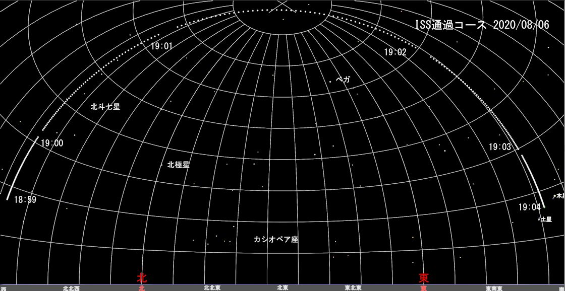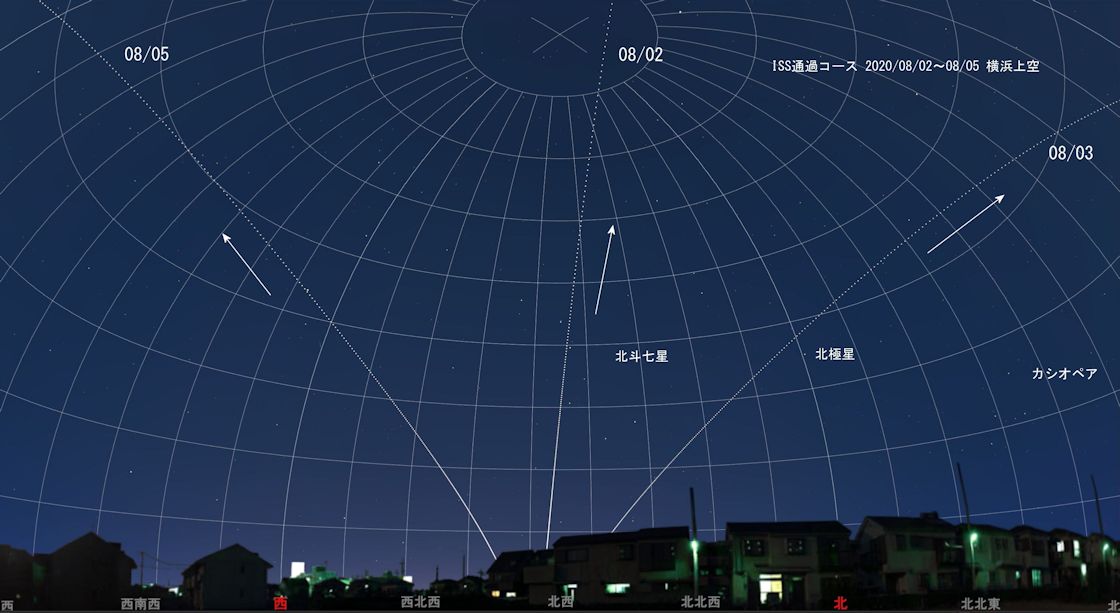 (ステラナビゲータ11による横浜上空におけるISS通過コース。星空は2020/08/02 20:30を代表表示)