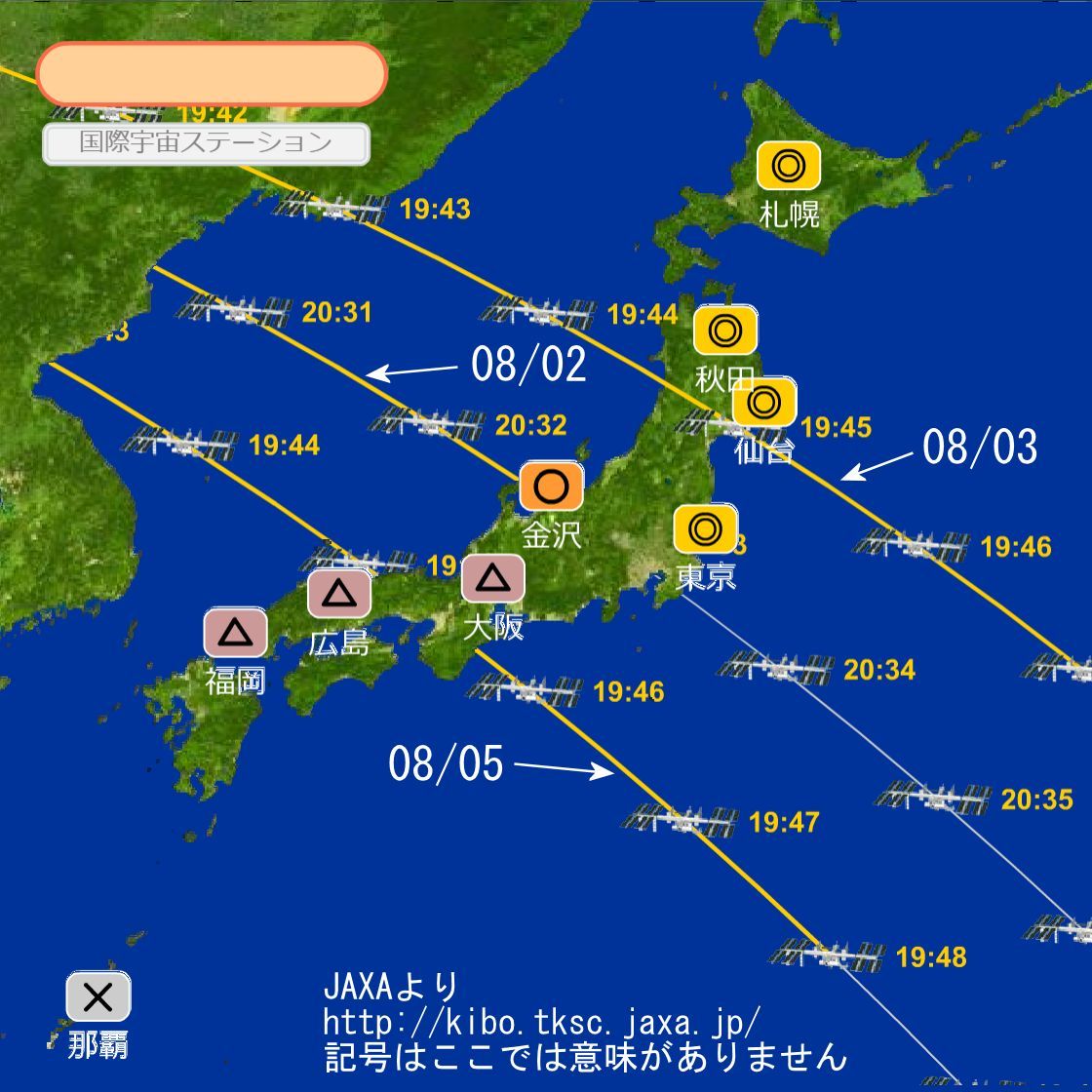 なお、下記ISSの軌道、通過時刻がわずかに更新されてズレる可能性がありますので関連リンクで事前に確認が必要です。(08/01時点、JAXAの日本列島通過マップではデータ更新により2,3分のズレがでています。)