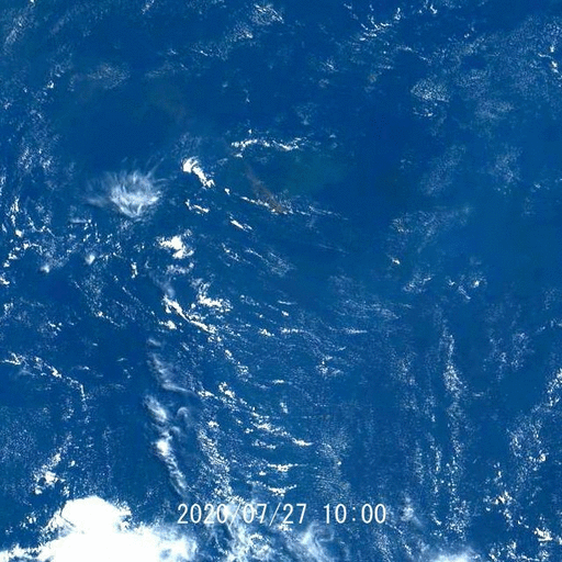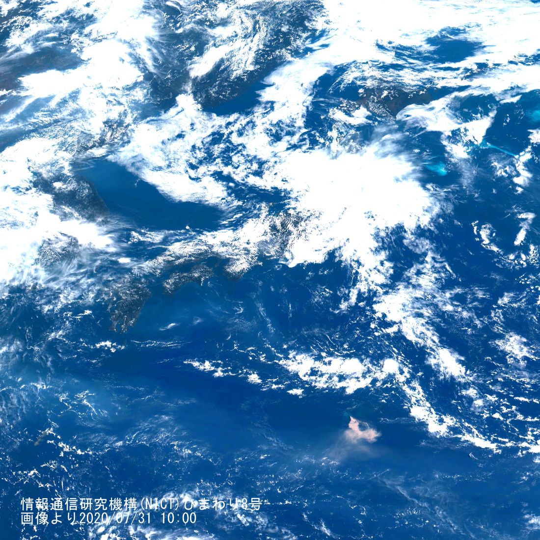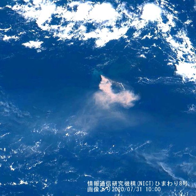 日本の小笠原諸島にある西之島の噴火が2020/7月になって活発との情報から気になり、6月に遡って時々「情報通信研究機構(NICT)」のひまわり8号の衛星画像を確認していました。噴煙の様子から7月上旬は活発で、中旬に下火になったように見えましたが、7月末にかけて再度噴煙と思われる面積がかなり広く写るようになりました。2020/07/31 10:00時点の画像を以下に示します。元の地球画像から当該部分を切り出して明度を極端に上げて拡大表示しています。写真下部に肌色に見えているのが西之島の噴煙、画像の上に写っている日本列島と比較するとかなりの広がりを見せています(北日本は雲で覆われていますが西日本の輪郭はわかると思います。15:10現在の画像はさらに広がりを見せていて、関東全域、四国全体を覆う大きさになっています)。