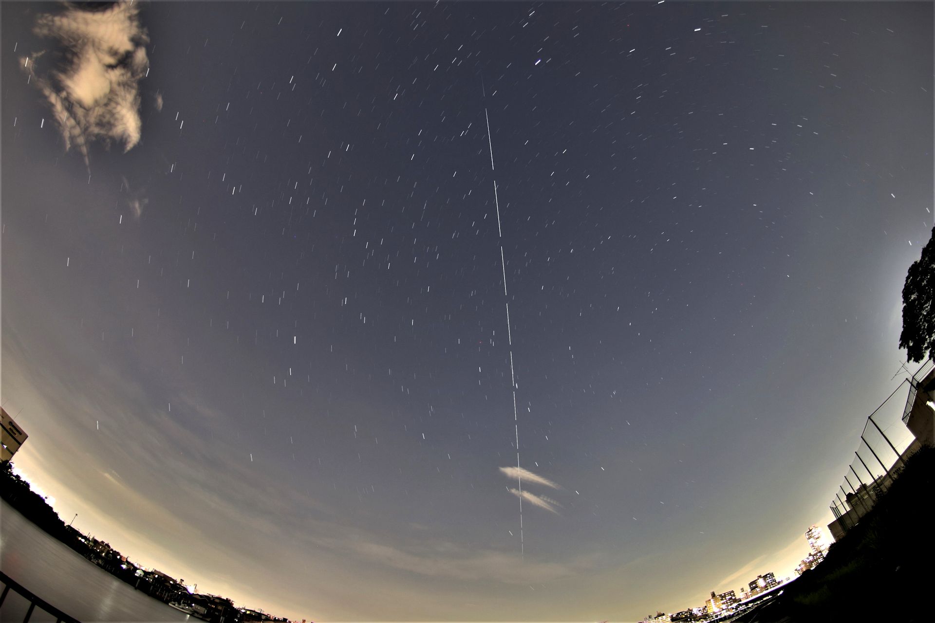 ISS光跡撮影 2020/08/02 20:33~20:36 EOS M6 ISO-400 10/1秒 f/2.8 7.5mm Sirius Compにより22枚を比較明処理合成 コントラスト及び明度等調整