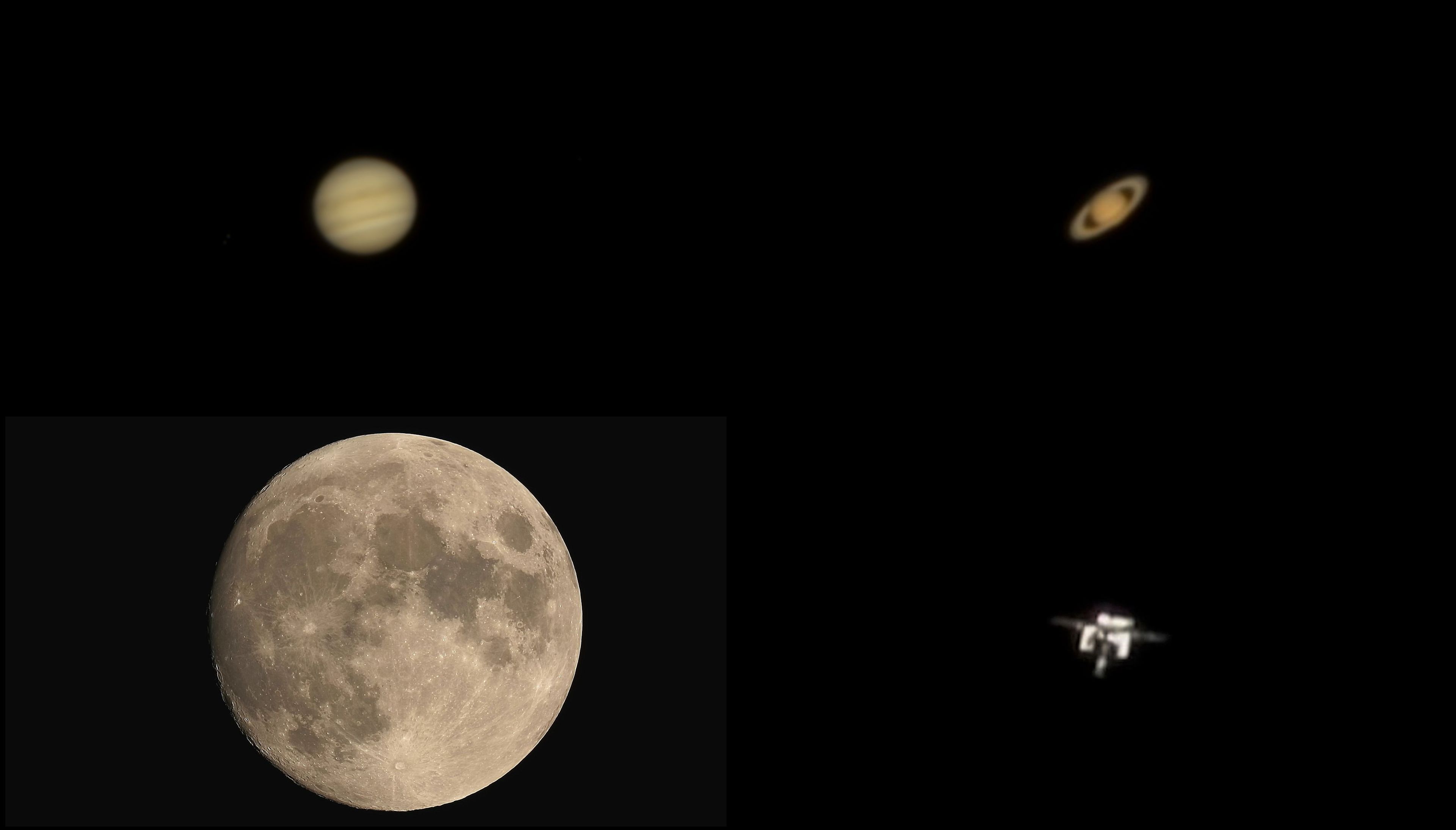 久しぶりに、このタイトル、この言葉。手軽に楽しめる撮影という意味です。ISS撮影後、カメラのみで木星、土星、月を30分間ほど撮影。人工天体も含めて四種類。四天体の倍率は統一していませんが、木星と土星は同じです。