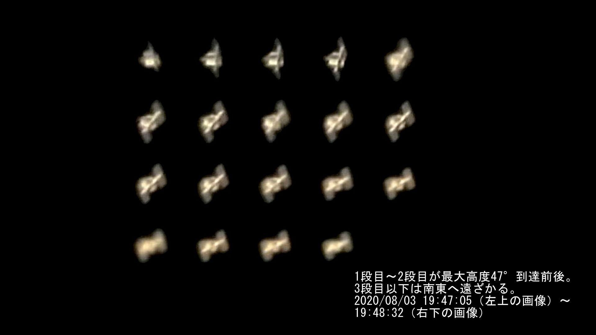 COOLPIX P1000。4K動画 ISO-800 f/8 1/800秒(/Frame) 3000mmです。2020/08/03 19:47:02~19:48:34。アンシャープネス、コントラスト、明度を調整しています。少し調整しすぎて粗くなってしまったかもです。(写真内の天頂とあったのを最大高度47°に訂正)