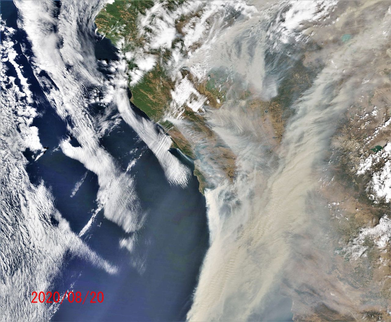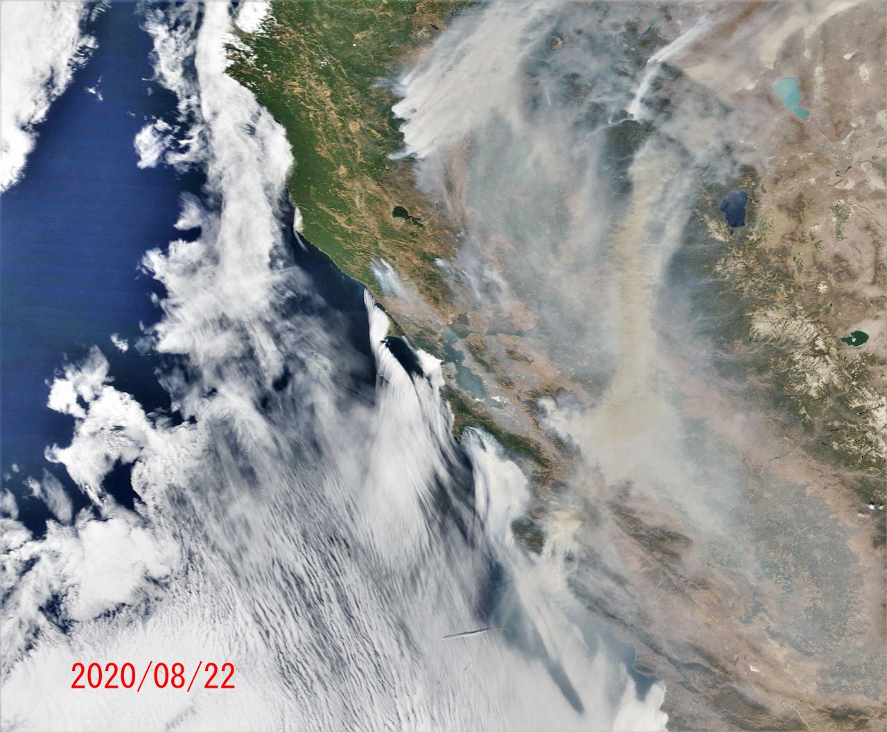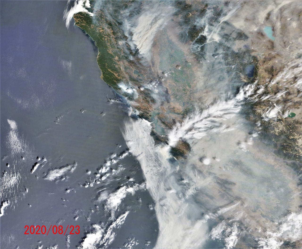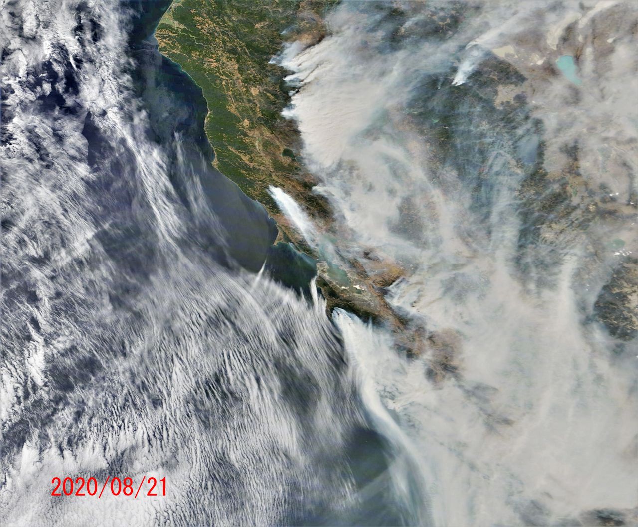 NASA WORLDVIEWから地球観測衛星 Terraの画像です。先週、サンフランシスコ周りの山火事のニュースを目にしました。雷により多数火災が発生したとのこと。気になりましたので衛星写真で確認。サンフランシスコを画像中心にして地上の輪郭が見える快晴の日を最初に、続けてその後の火災状況(08/20~08/23)の画像を以下に示します。