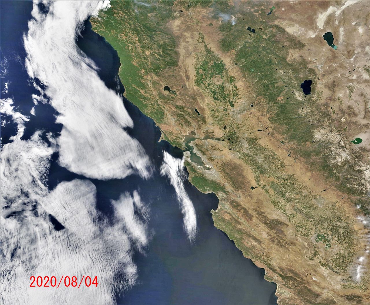 NASA WORLDVIEWから地球観測衛星 Terraの画像です。先週、サンフランシスコ周りの山火事のニュースを目にしました。雷により多数火災が発生したとのこと。気になりましたので衛星写真で確認。サンフランシスコを画像中心にして地上の輪郭が見える快晴の日を最初に、続けてその後の火災状況(08/20~08/23)の画像を以下に示します。