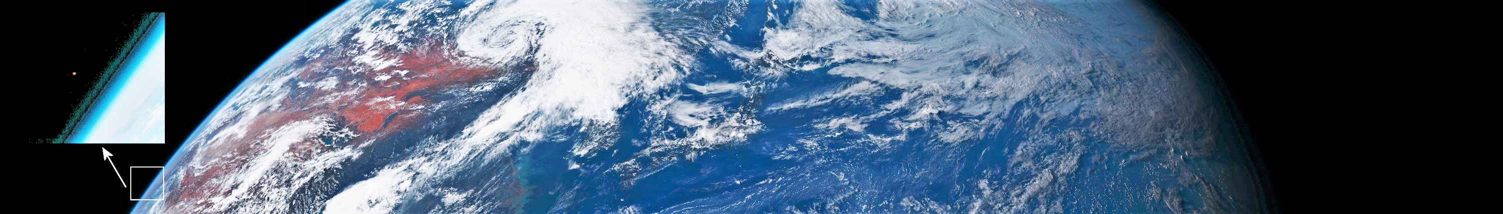 現在ひまわり8号で地球の背後に見えるのは月以外に火星、海王星です。火星だけは写っているだろうと予想してゲーム感覚で探し出しました。例として2020/08/13 15:10の地球全体画像から火星の部分を切り出し、かつ、拡大した画像を以下に示します。判別しにくいですが中央に雲の下にやや黒く日本列島が見えています。(そのままの画像では火星は見えません、あまりに小さいので無理です。しかし、強烈に画像調整すると見えます。火星はピクセル単位でしかも赤、青、緑の可視光になってしまいます。ノイズではありません、このような画像はNo.551で経験済みです。)