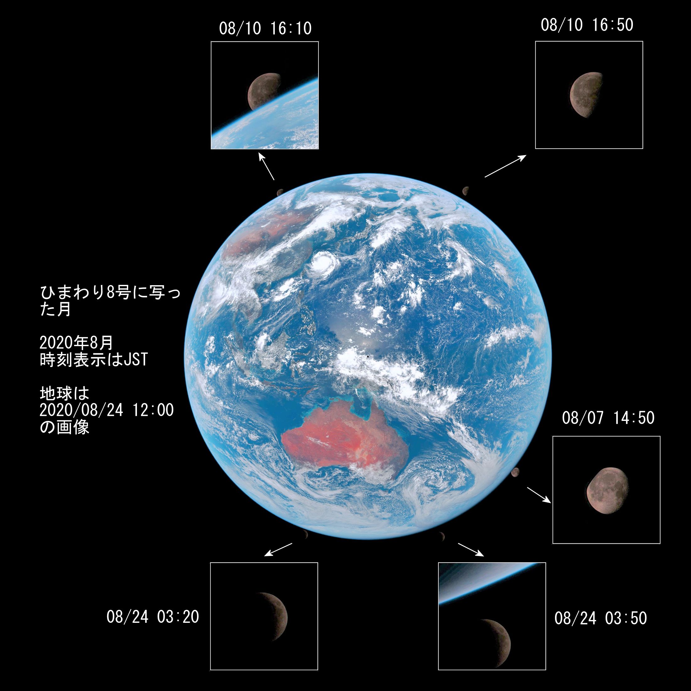 久しぶりにひまわり8号による月を見たくなりましたので、2020年8月の一か月間に捉えられた月の画像を抽出しました。すべて画像は「情報通信研究機構(NICT)」のひまわり8号の衛星画像によります。8月中に見えた5枚の画像を比較明処理で一枚にしています。なお地球の画像は2020/08/24 12:00のものにしています、台風8号が見えています。