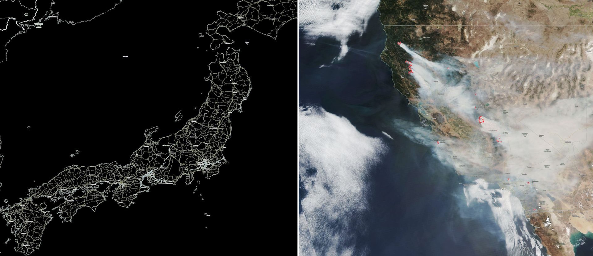 今日のNASA Top pageに同じような記事、画像が載っていました(数日で内容が更新表示しなくなるでしょうから元記事をリンクしておきます)。https://www.nasa.gov/feature/goddard/2020/noaa-nasa-suomi-npp-captures-fires-and-aerosols-across-america Last Updated: Sept. 9, 2020 Editor: Lynn Jennerとあります。大気汚染として分析された説明もなされています。科学情報としてなのですが、毎年火災があるとは言え、この火災何とかならないものでしょうか。あらためて鎮火を祈ります。