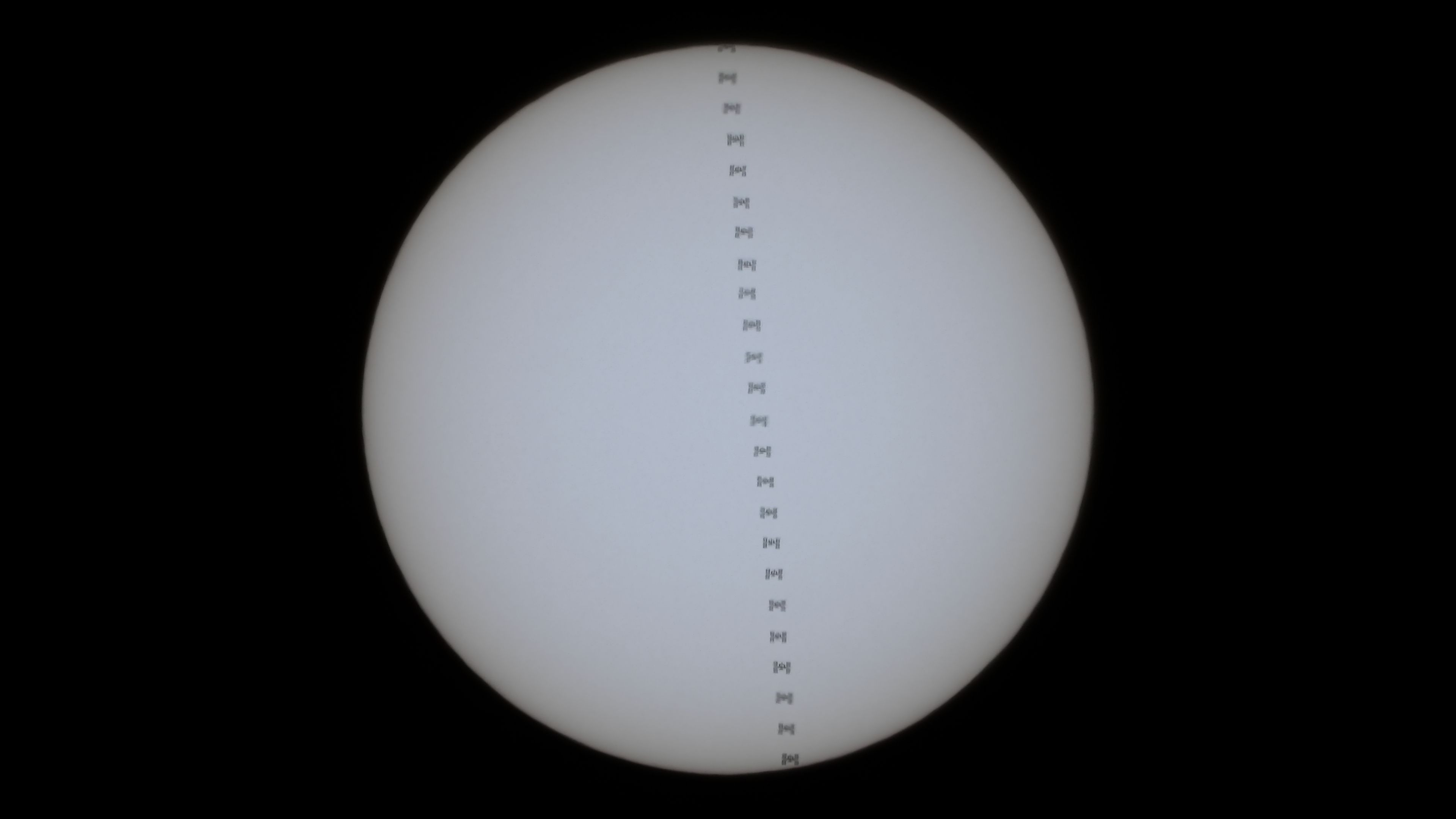 焦点距離は35mm換算で1,800mmです。上から下に向かって進むのがISSです。NDフィルターを付けています。6秒間で太陽が右上にシフトしていく様子がわかります。(この方が天体動画らしいかも知れません)