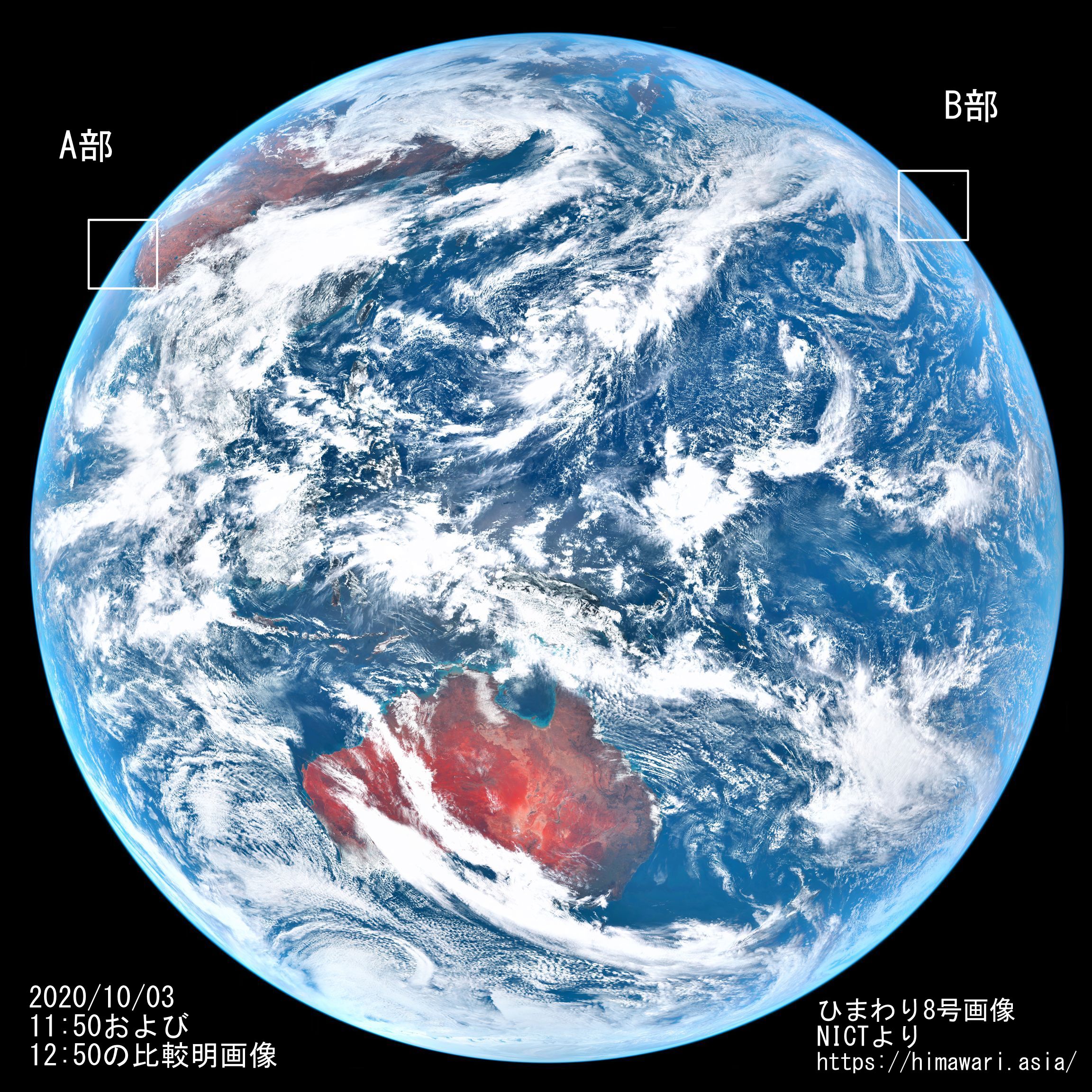 該当画像を「情報通信研究機構(NICT)」のひまわり8号から取得し以下に示します。2020/10/03 11:50(JST)および12:50の比較明合成画像です。画像は明度を上げています。A部(11:50時画像)に月のみ、B部(12:50時画像)に火星が写っていました(この画像でも拡大すると見えてきます)。