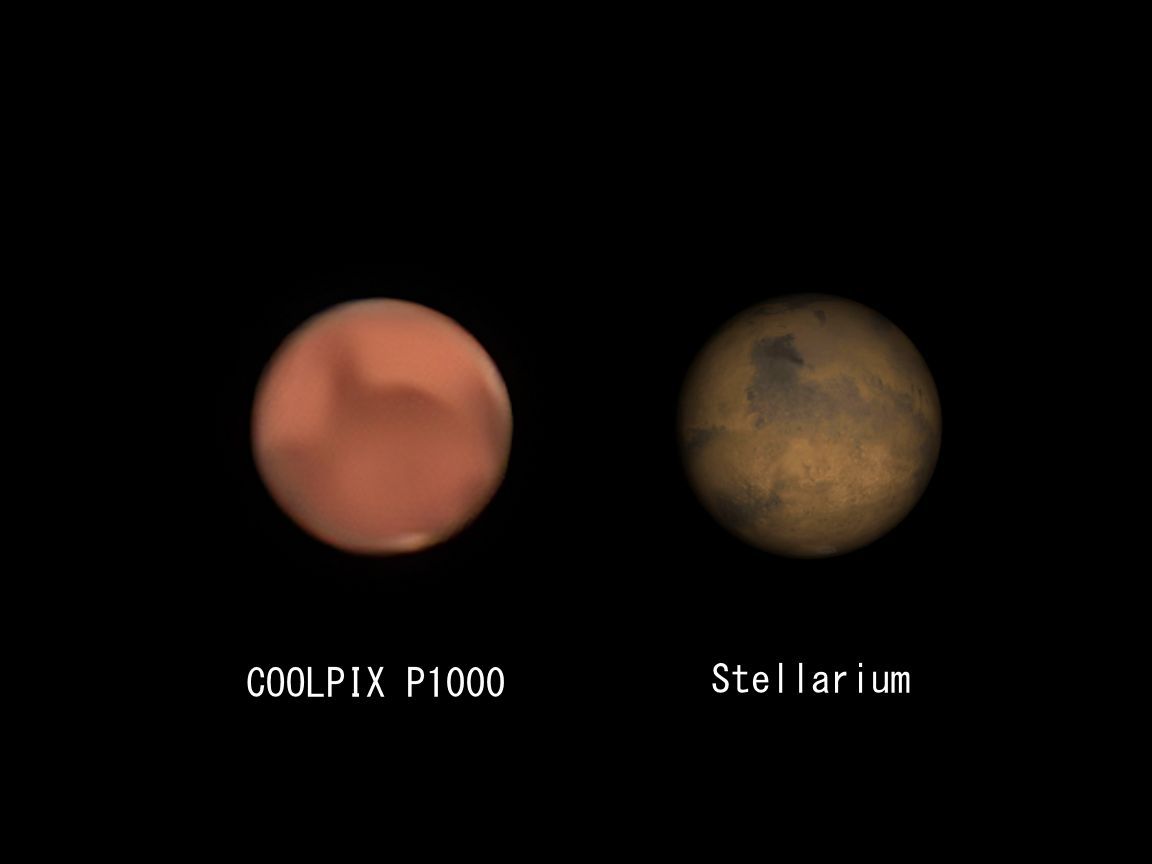 シミュレーターによる画像よりも望遠鏡による詳細な写真と比較する場合、この時期ですので火星写真がたくさん公表されています。当日同じような時刻で撮影された望遠鏡の写真はAstroArtsの写真ギャラリーから見られます。例としてほぼ同日、同時刻の火星写真を以下に。100~320mm口径の望遠鏡の写真です。他にも日時に関係なくたくさん撮られています。