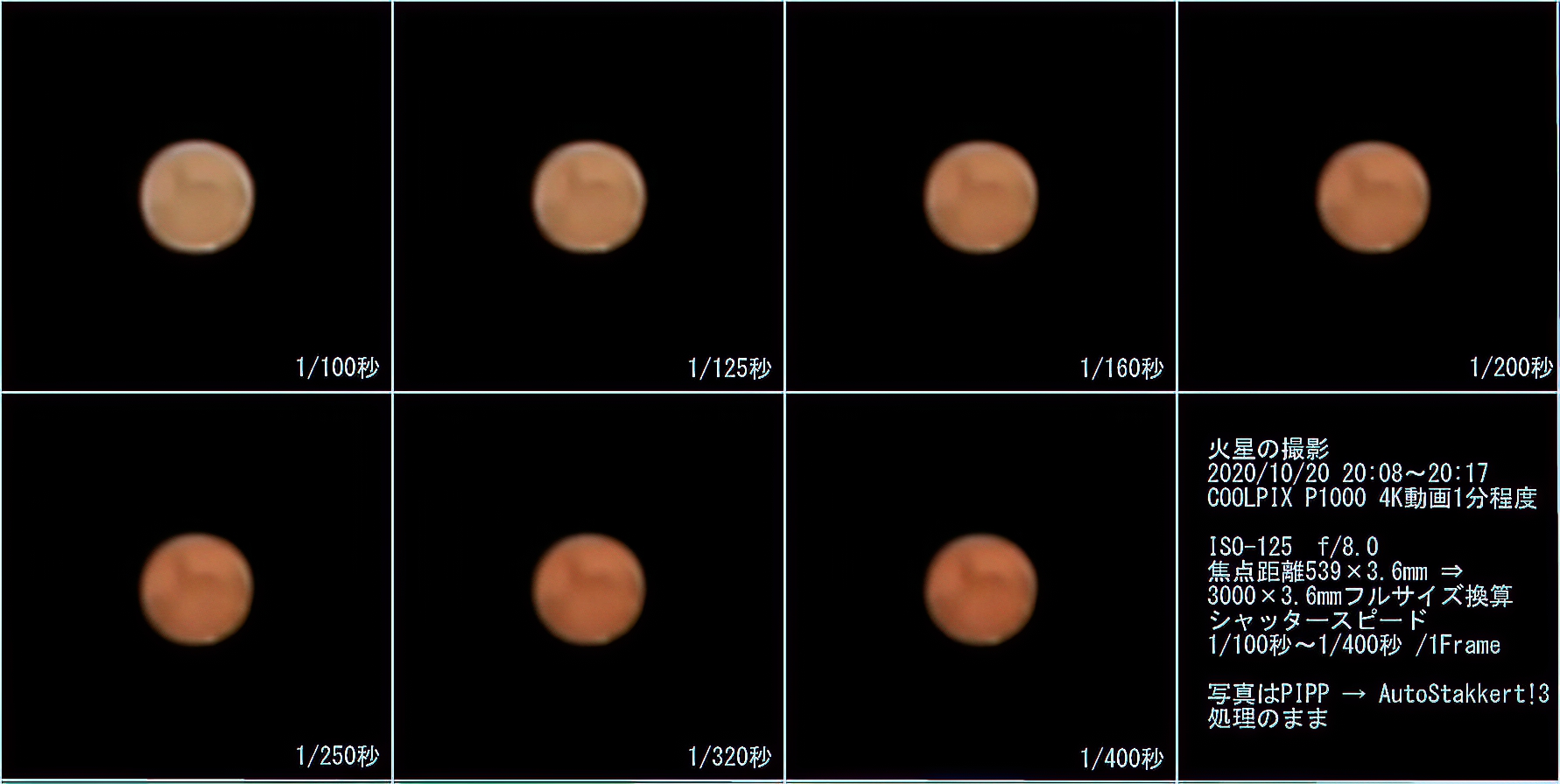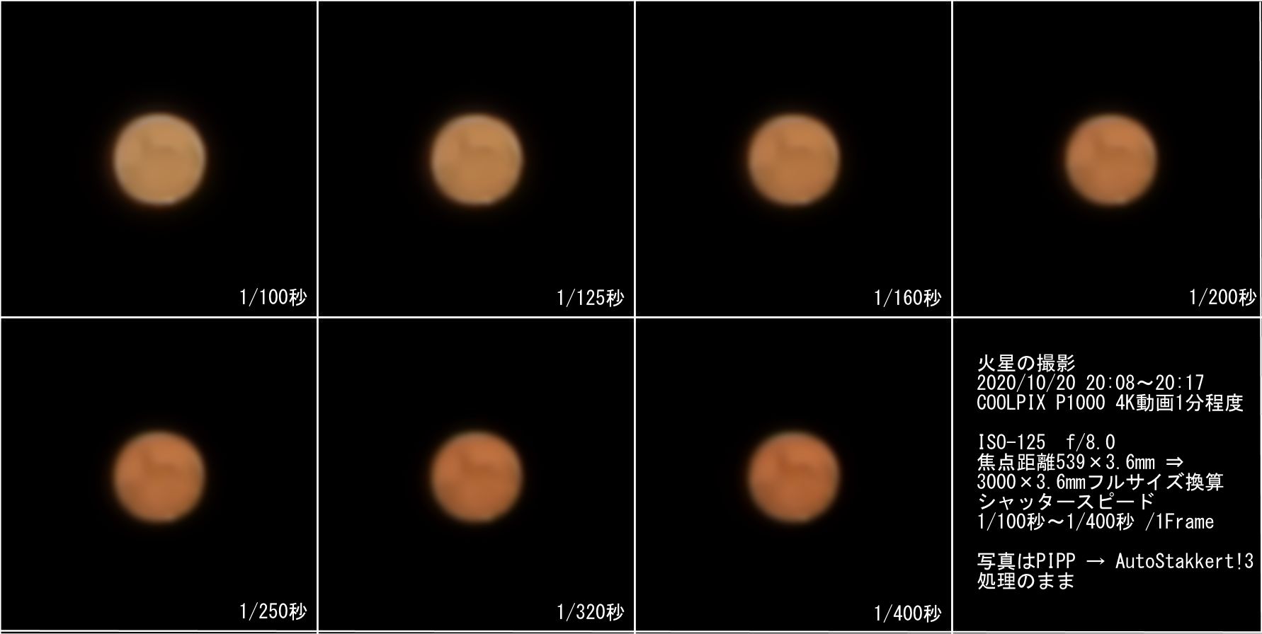 4K動画の撮影条件はISO-125, f/8, 539×3.6mmで、1フレームあたりのシャッター速度はパラメータとしました。20:10台の10分間で7条件(1ファイル1分間程度の記録)の撮影を実行。まだ早い時刻ですが、火星は空の高い位置になりつつ、その分大気の揺らぎも少しは良くなっていたと思います。