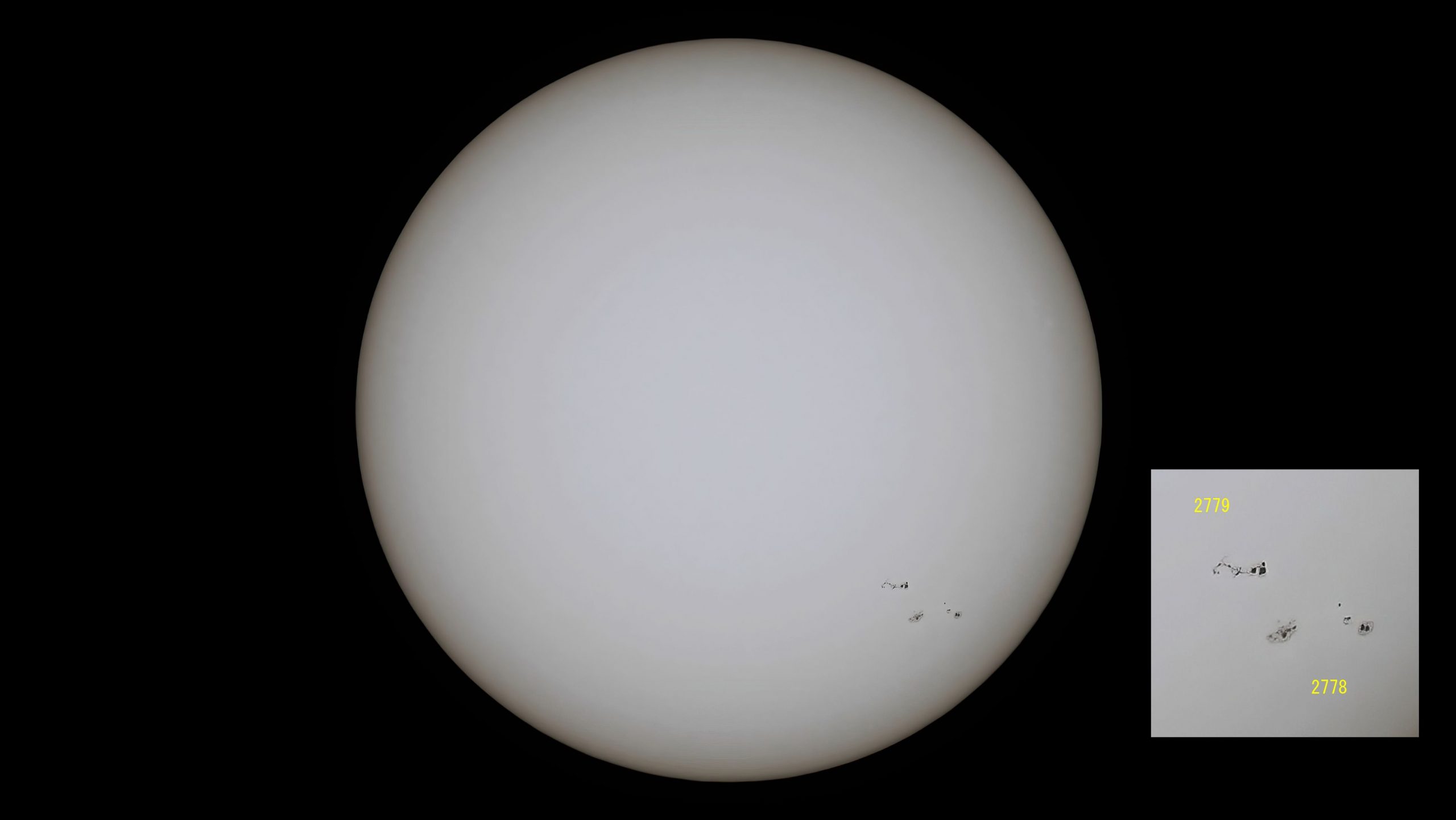 黒点2779は2020/10/28 15:00(UT)頃に現れたようです。昨日2020/10/29 14:17~14:21(JST)にCOOLPIX P1000で4K動画撮影。ND5.0使用, ISO-125, f/6.3, 1800mm, 1/1250s/1Frame。PIPP → AutoStakkert!3 → TopazDenoiseAIで調整。