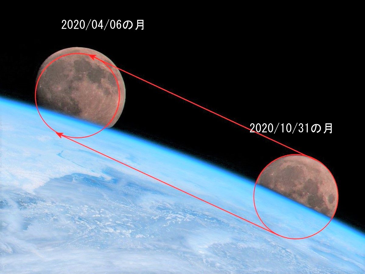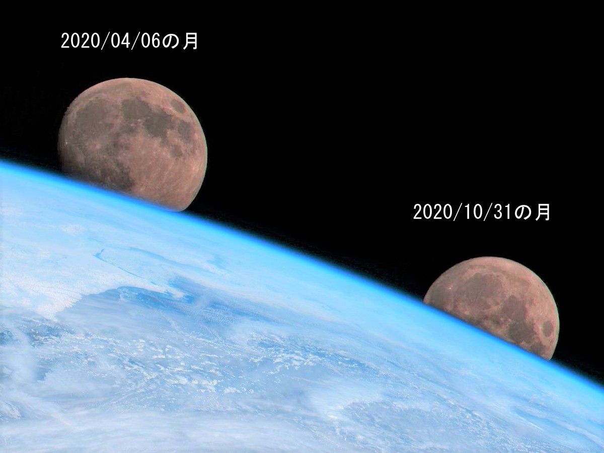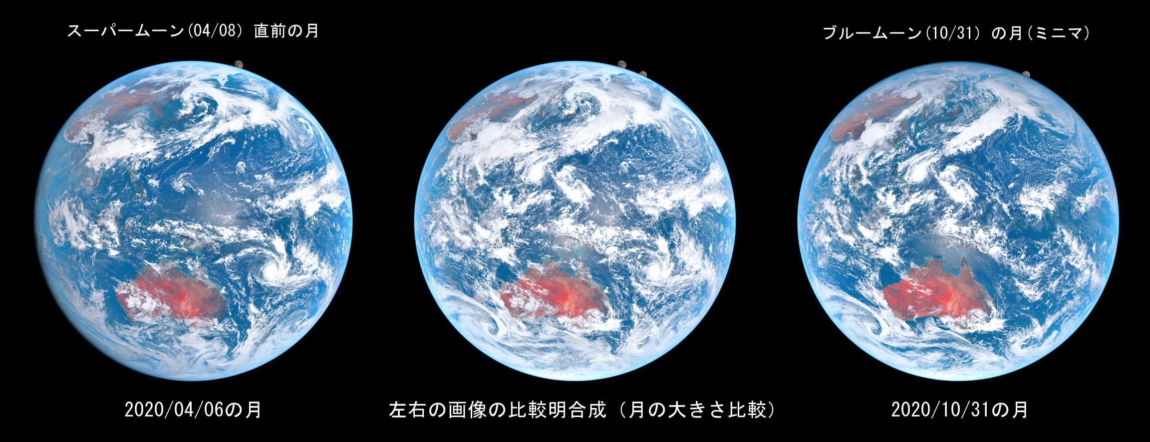 月の軌道は楕円のため地球との距離により同じ満月でも大きさが変わります。昨日2020/10/31のブルームーン満月は地球から遠く小さく見える月ともなりました、ミニマムーンと呼びます。逆に大きく見えた月、地球に近づいたスーパームーンは今年の春(2020/04/08)でした。この満月もひまわり8号から取り出して大きさを比較してみます。