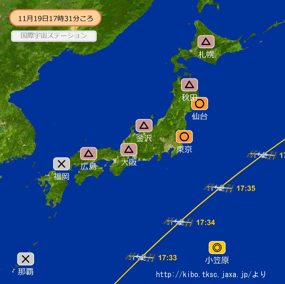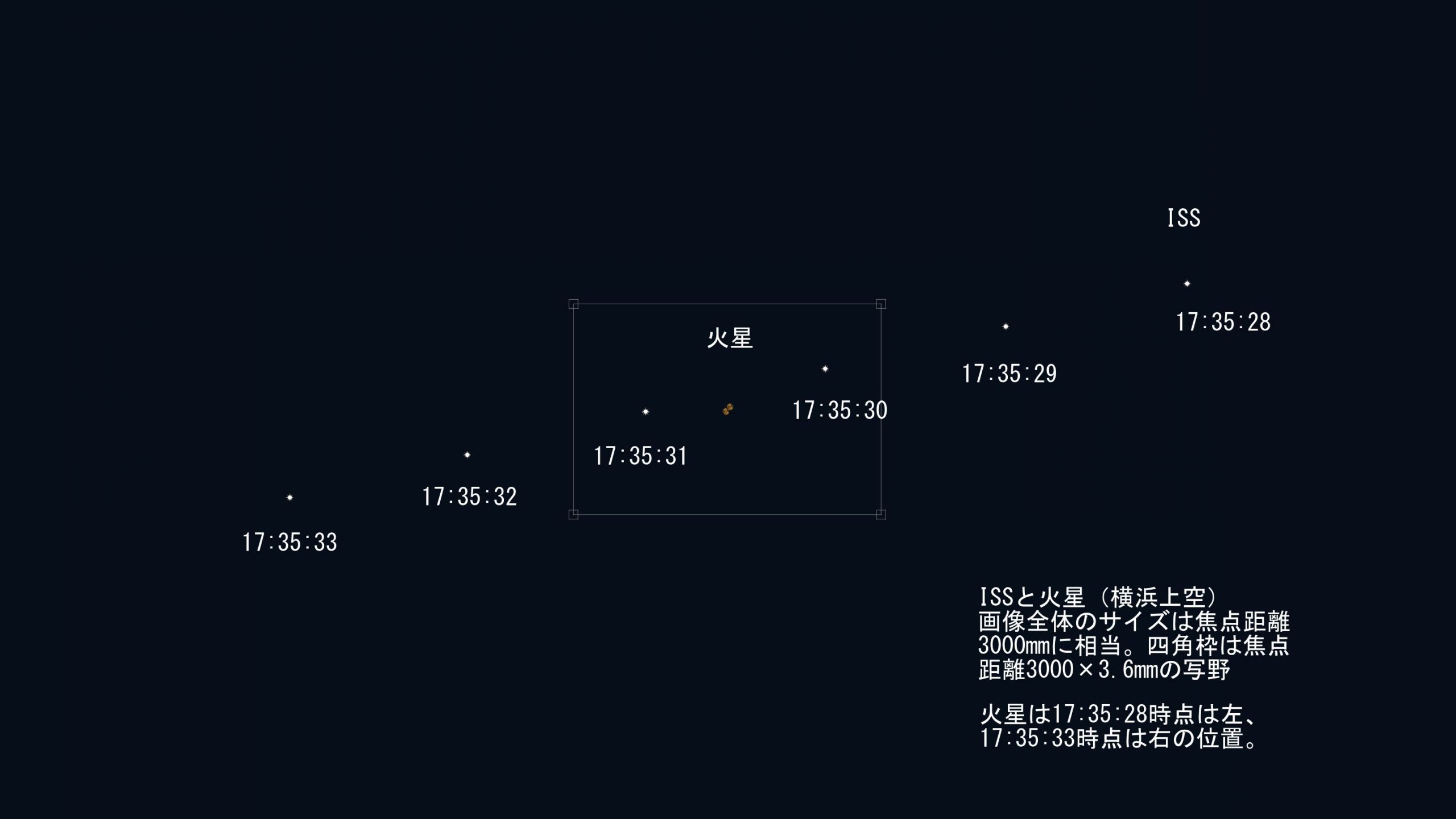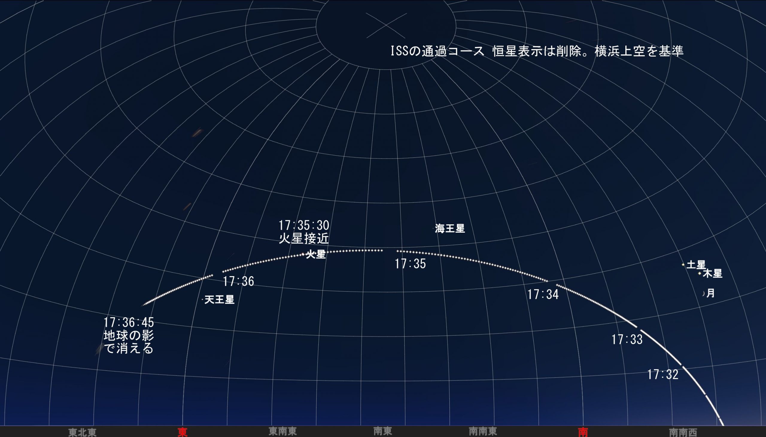おーっ、今日は火星に接近です。しかも昨日の木星接近よりISSは大きく写る。とにかく晴れ希望。こんなチャンスは固定位置で訪れるなんて滅多にありません。マイカーで火星にISSが重なる場所を求めて望遠鏡撮影される方がいらっしゃいます。今回は調べた範囲では横浜市の大本山總持寺あたり。クルードラゴンがドッキングしたばかりなので興味が増します。17:35:30秒に火星の近くを通過するISSを見ましょう(時刻はISSの軌道修正が行われない限りです。直前に確認すれば確実)。(2020/11/20追記。No.793に撮影記事、拡大撮影成らず光跡撮影のみになってしまいました) 通過情報を以下に載せておきます。横浜上空です。