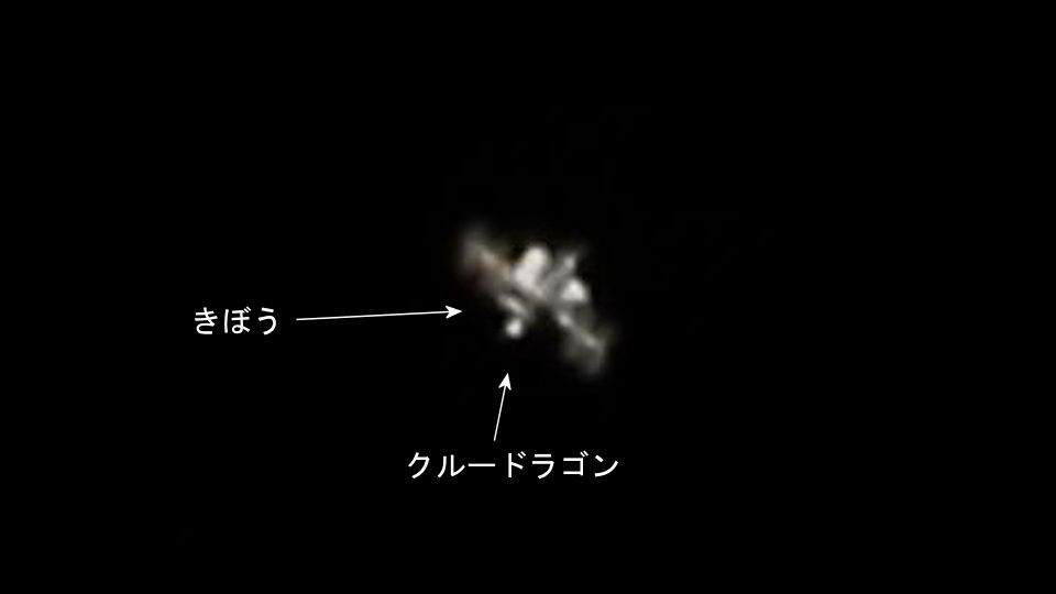 クルードラゴンは先頭にドッキングしていて、下から見上げると左に「きぼう実験室」が見えています。7名の宇宙飛行士が滞在していて、そのうちの一名が日本の野口聡一宇宙飛行士が滞在しています。