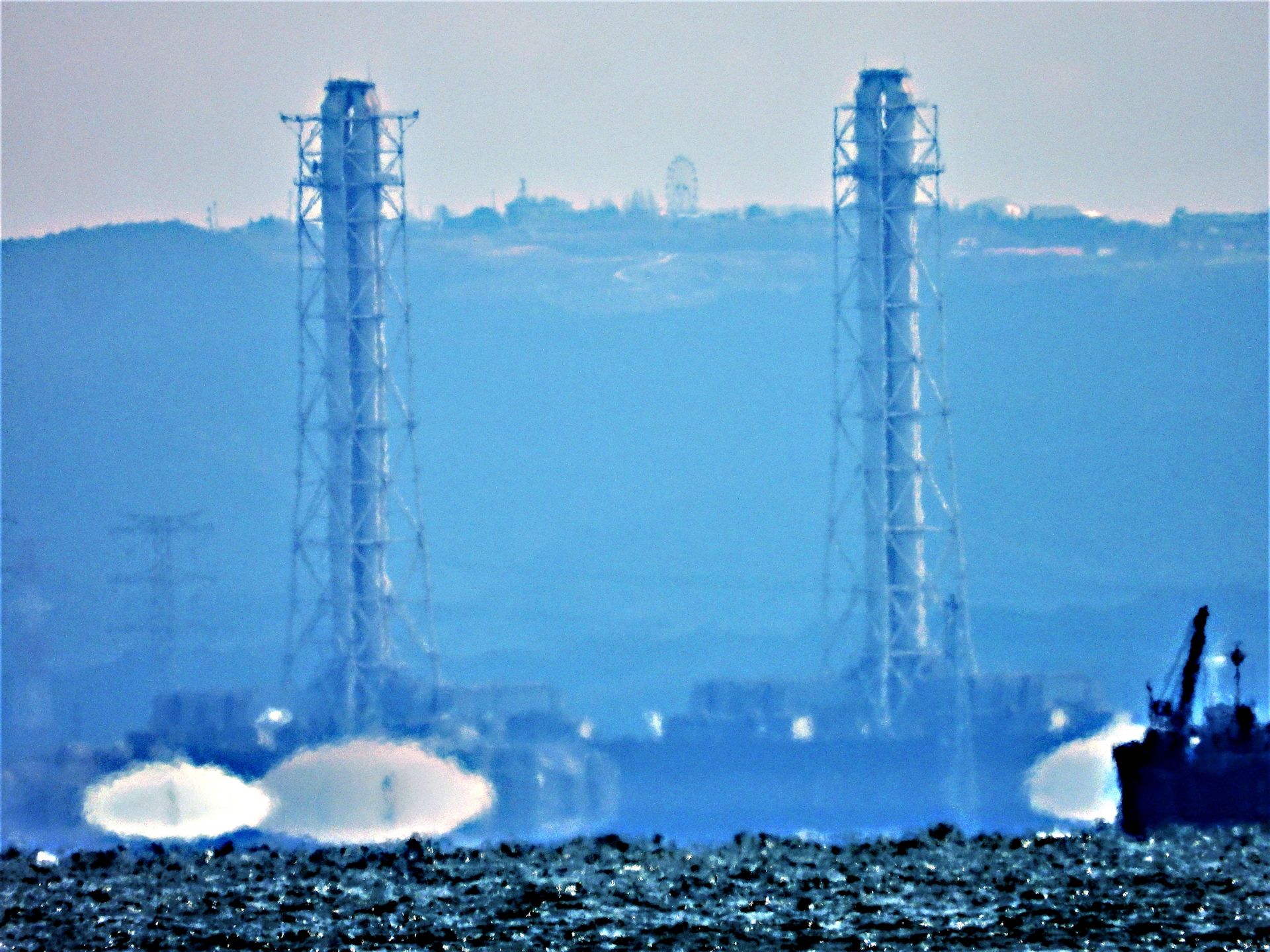 水平線の先に房総半島が写っています。9mm(50mm相当)による写真です。この写真の下端、水平線近くの中央を359mm(2,000mm相当)で写した写真を次に示します。火力発電所、さらに遠くにたぶんマザー牧場と思われますが、観覧車が見えています。葉で覆われた地面のように見えるのは海面の波です。この程度の距離(20km)で海面の下またはすれすれに地上景色が見えることから地球が丸いというのは考えすぎでしょうか、小学生の頃の思い出。