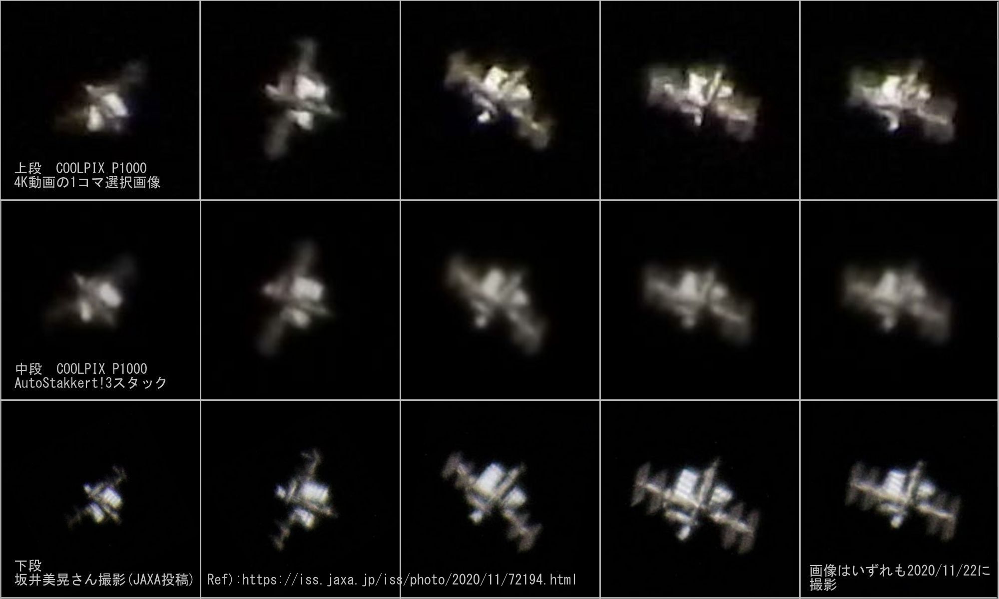 中段は1カットとして3秒間以内のフレームとしAutoStakkert!3でスタック処理しています。上段の単体フレームの方は輪郭がクッキリとしている半面、ブレ、シンチレーションの影響で形が歪みます、一方、スタック画像は輪郭ははっきりしませんが、全体のその時の姿、形を示しているように思います。全体のISSの姿は捉えられていて「きぼう」や「ドラゴン」、ラジエーター、トラス、ソーラーパネルだろうと推察はできます。