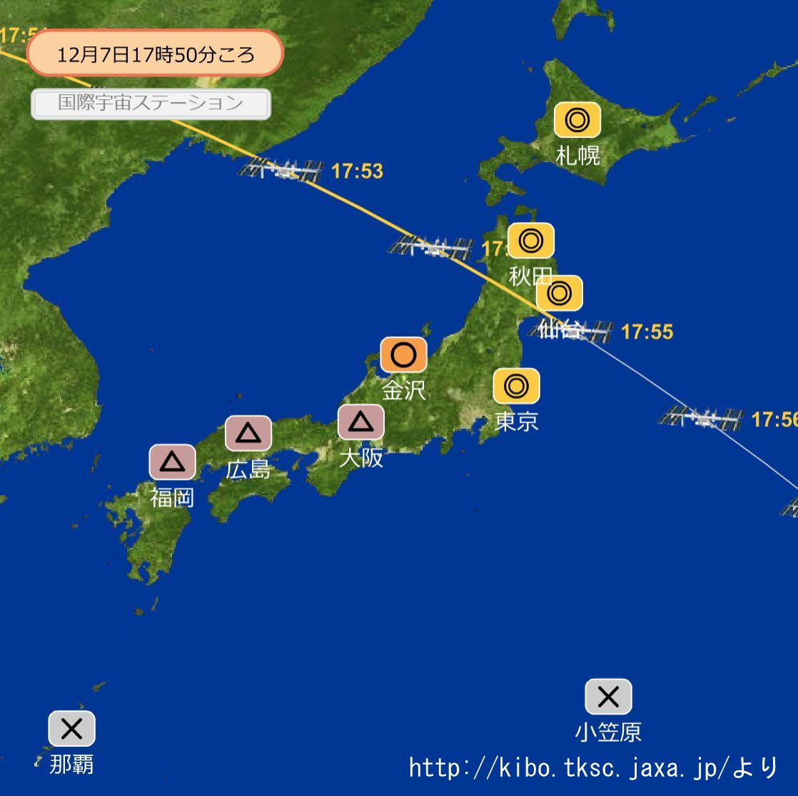 当日のステラナビゲータ11による撮影地点の夜空の画像とJAXAから引用した日本列島通過コースの図も最後に載せておきます。如何に撮影場所がクロスする地点に近かったことがわかります、また、撮影時は17:54:15ほどですから日本海から秋田県上空に差し掛かかる直前だったでしょうか。遠いので光る点程度かと思いましたが形はボケていますがなんとなくISSらしく見えています。