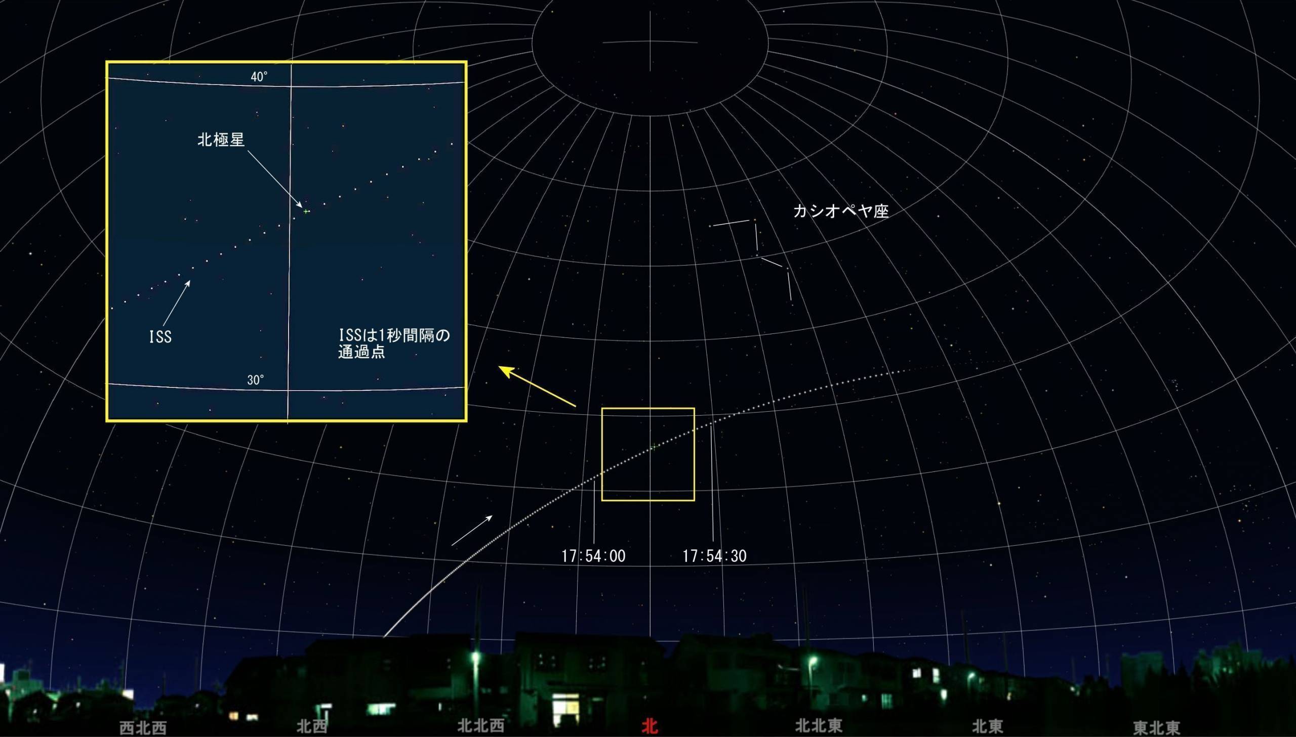 映像のほぼ中央にチラチラ光っている点が北極星です。左端に見え始めた瞬間が撮影時刻とコマ数から計算すると17:54:14で映像内を1.3秒で通過しています。3,000mm相当の倍率(このカメラの仕様では125倍)ですので再生を一時停止するとISSは光る点よりもソーラーパネルの形状が何となく見えているように思います。No.796等のようにクルードラゴンは見えませんけれどドッキング状態をキープ、野口宇宙飛行士が滞在しています。