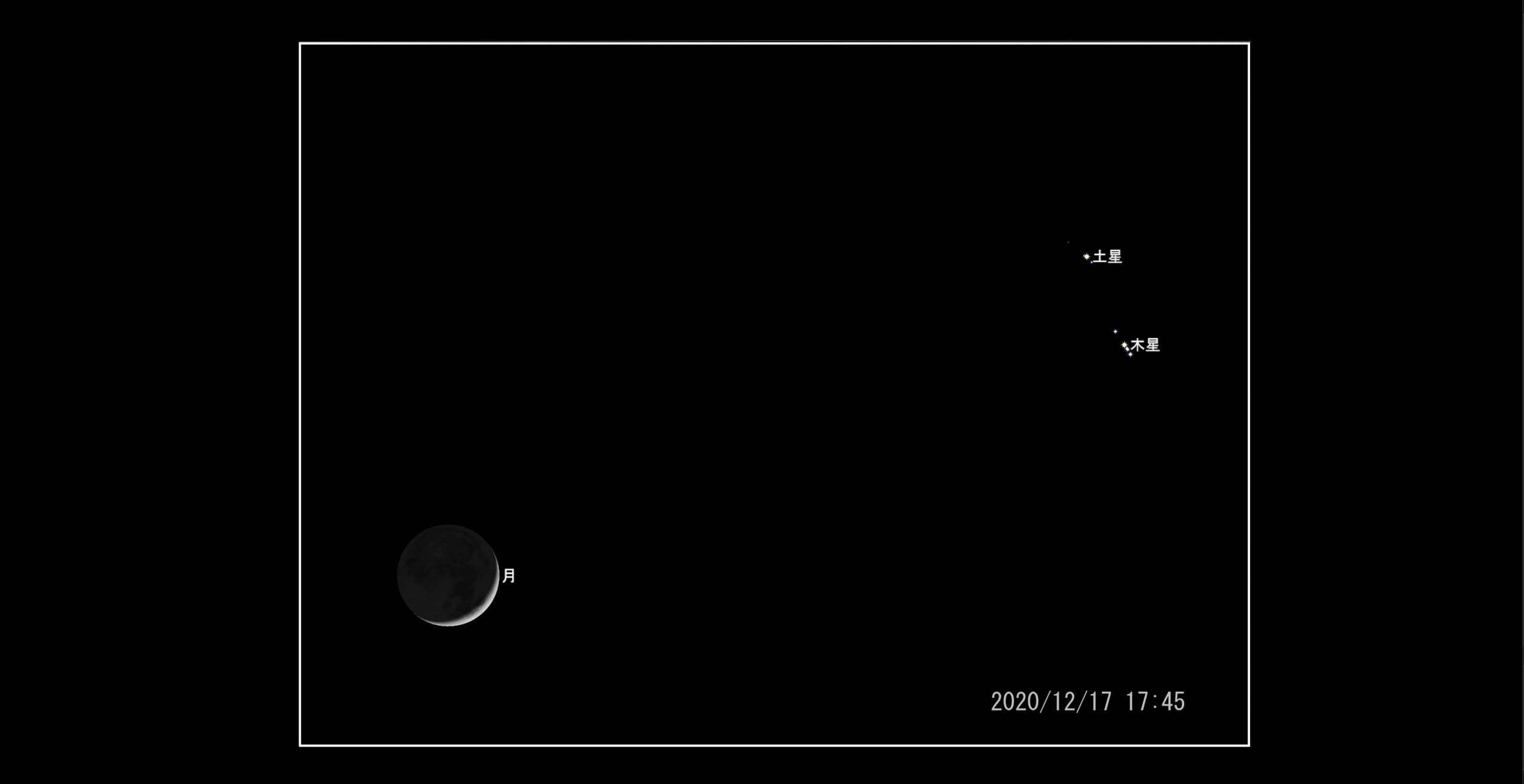 まず、2020/12/17は三日月(月齢2.7)、木星および土星の3ショット。400mmレンズの望遠で撮影した場合の画像をシミュレートしました。月と惑星の2ショット、3ショットは過去にも撮影しています。No.598(月と土星:1,000mm相当)、No.605(月と木星:650mm,860mm相当)、No.627(月と木星と土星:70mm相当)、No.628(月と土星:1,400mm相当)、No.629(月と土星:No.628の続き)。