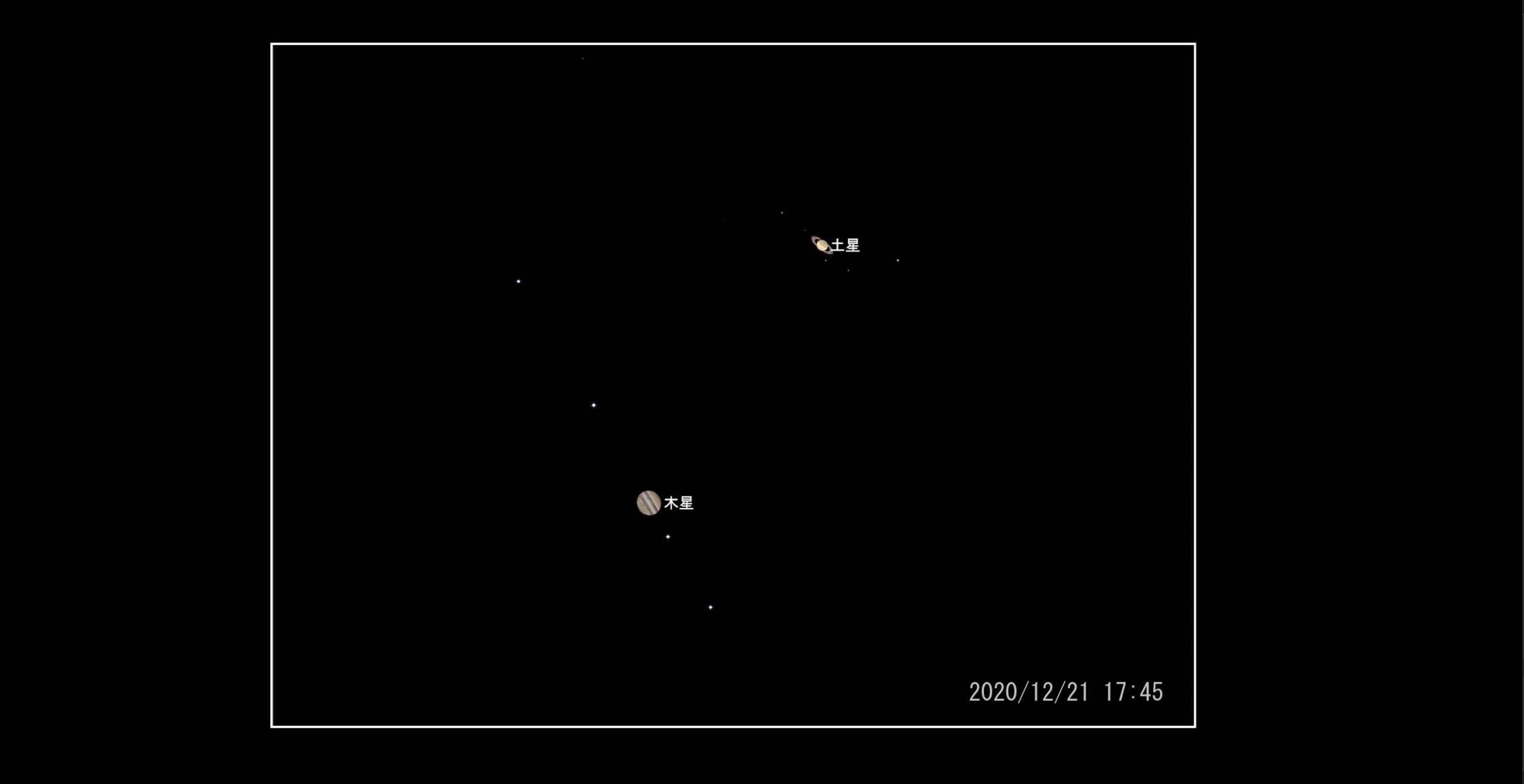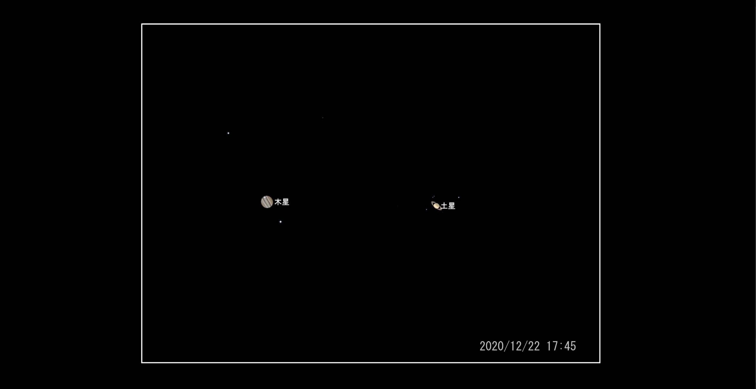 次は2020/12/21と12/22です。6,000mm~12,000mm(衛星は外れます)相当の焦点距離の画角に納まりますので、惑星の姿がハッキリすると予想されます。このような惑星2ショット写真は今までに撮ったことはありません。一日の経過で木星と土星の位置が逆転します。