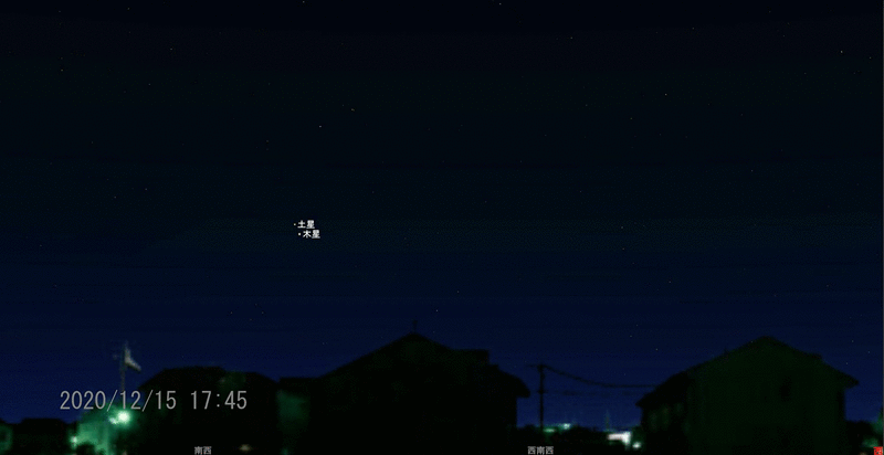 太陽系座標で地球、木星および土星が直線状に並びますので、年末の夕空に木星と土星が並んでポーズしてくれます。インスタ映えの撮影チャンスです。2020/12/15~2020/12/25までの間、一日毎(毎日17:45)の南西の空を動画調にしました。ステラナビゲータ11による編集です。現在は土星が木星の左上にいますが、徐々に近づきます(少し画像が暗すぎたかも)。昨日の写真はNo.812のとおりです。35mm焦点距離で800mm相当(COOLPIX P1000使用)で撮影しています。