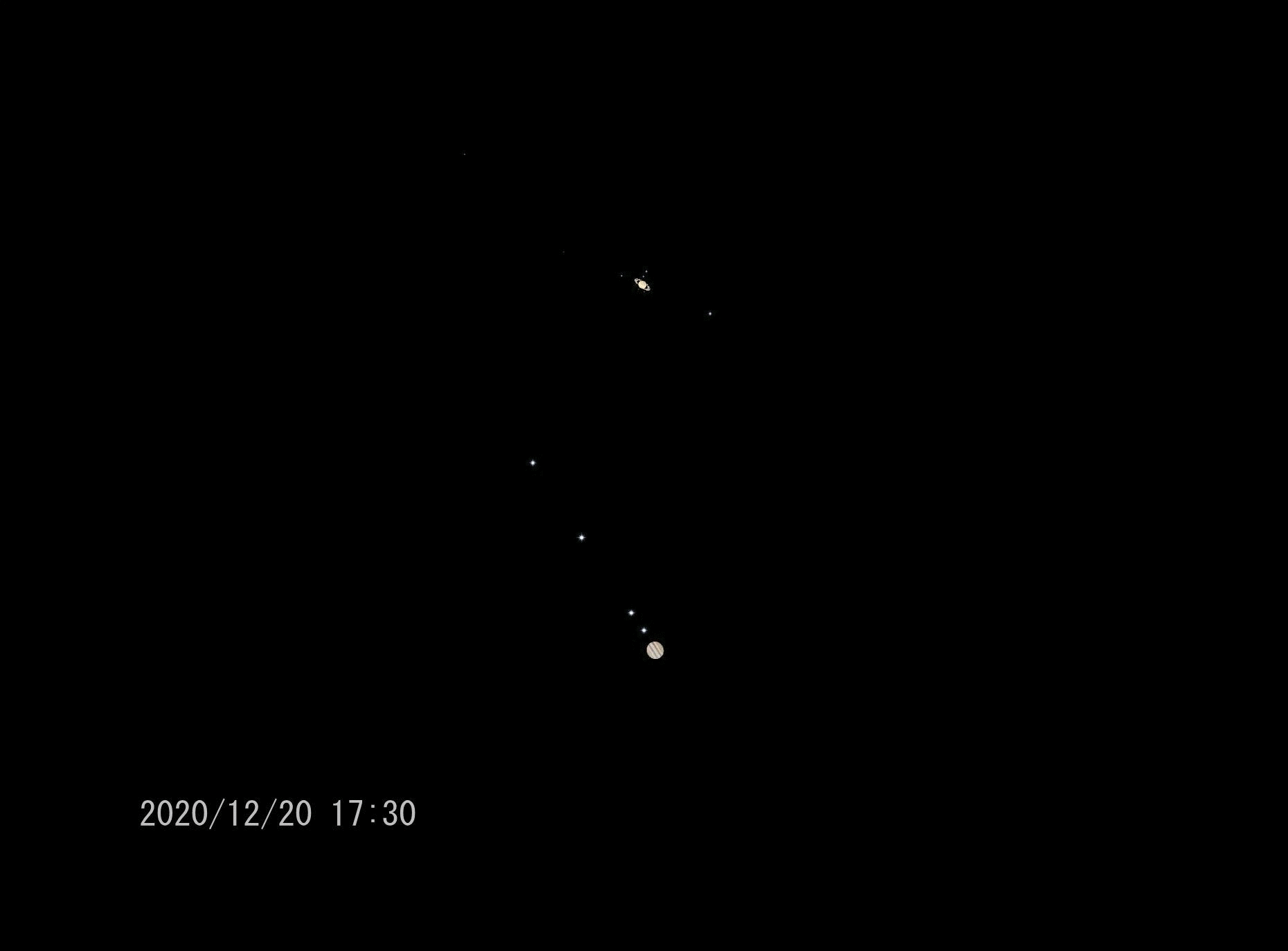No.818に続きます。昨日の4K動画。リサイズしています。月、土星/木星(ガリレオ衛星の有無映像)の3ファイルを10秒間ずつまとめて。揺れているのは風の影響です、映像はできるだけ揺れていない部分を取り出しました。それと重複しますが昨日12/20から12/24までの3,000mmの時の土星と木星の位置関係をステラナビゲータ11でシミュレーション。 https://photo.nomata.com/wp-content/uploads/2020/12/Moon_Sat_Jup_20201220.mp4