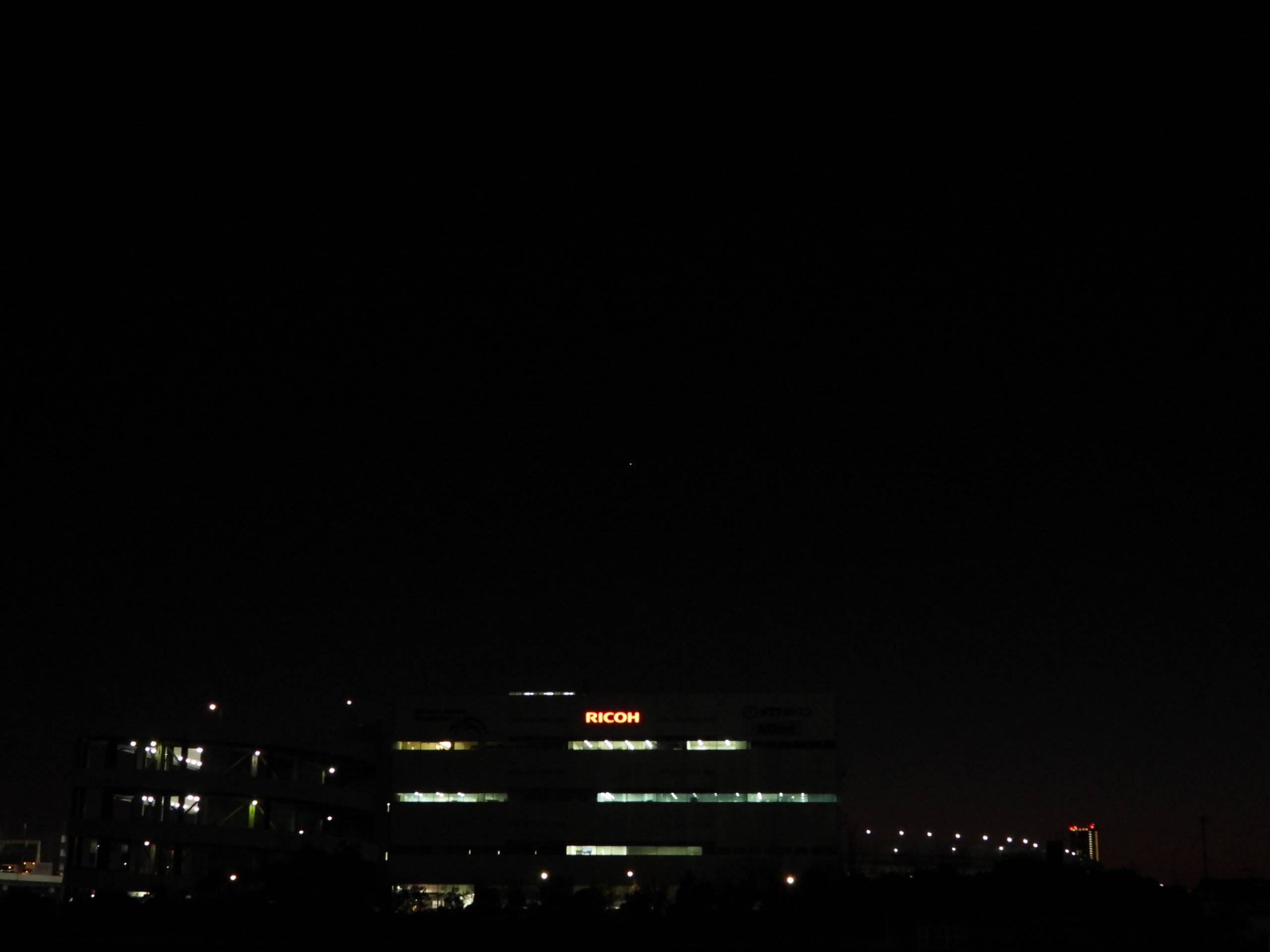 以下は焦点距離50mmの標準的な画像を示します。たまたま建物に会社名が目立つ写真ですが撮ったのはK-70ではなくてCOOLPIX P1000です(関係ない話でした)。中央に光る点が木星(土星は木星に比べて暗いので見えていません?)。肉眼では乱視のためか、木星の右横に土星が見えたように思いましたが勘違いです。8倍の双眼鏡で見ると木星の横に土星が並んで見えていました。焦点距離を長くして撮った画像を整理しました。もっと明るく写るようにすれば良かったのですが、この例では100mm以上で徐々に分離して見えます。