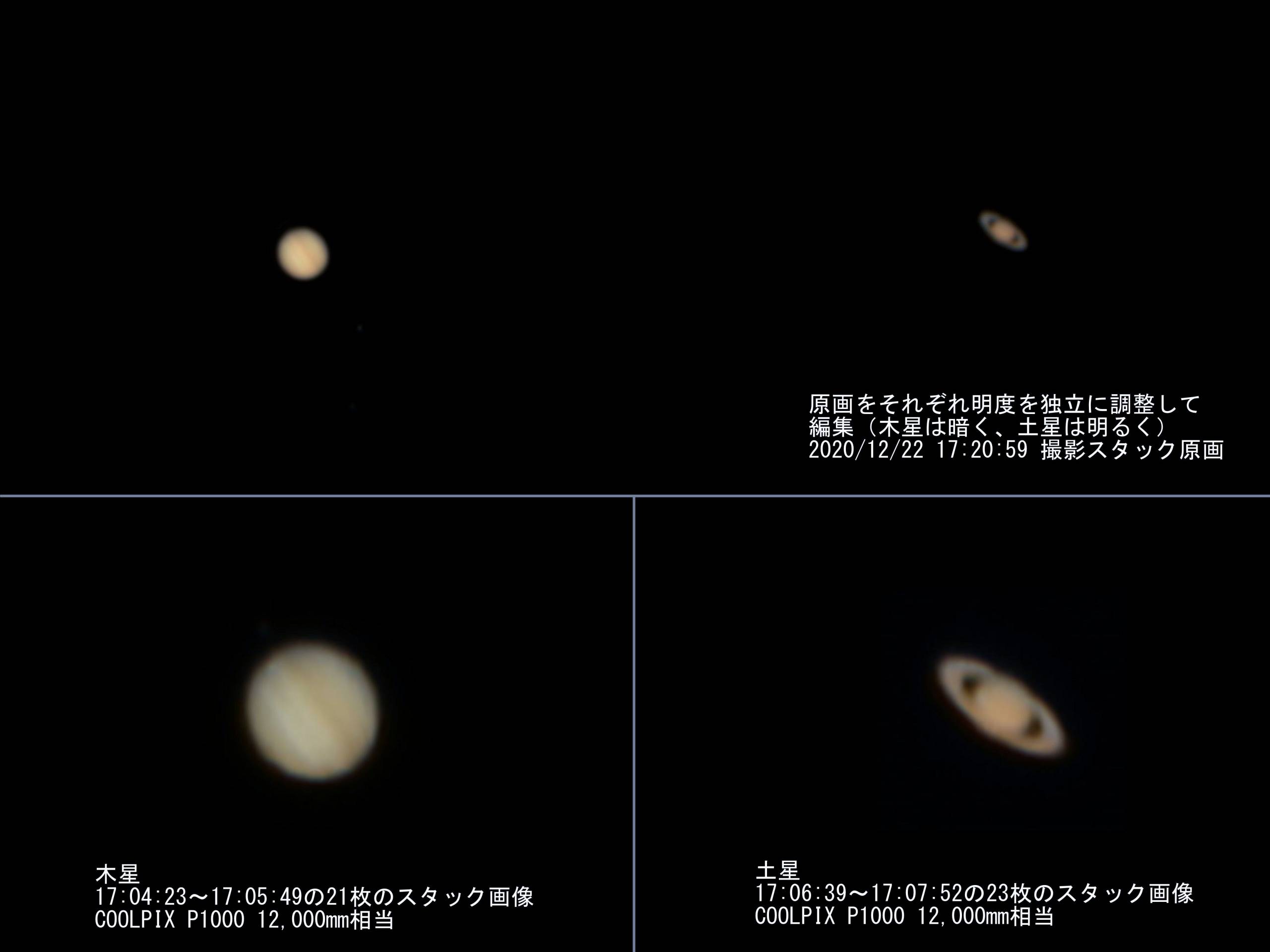 上半分の画像では土星が暗すぎますので明度補正し、これと木星、土星を最大倍率で撮影した結果を組みあわて以下に示します。この時刻では大赤斑が下周辺部にあるのですが、もやっと見えているようにも思えます。